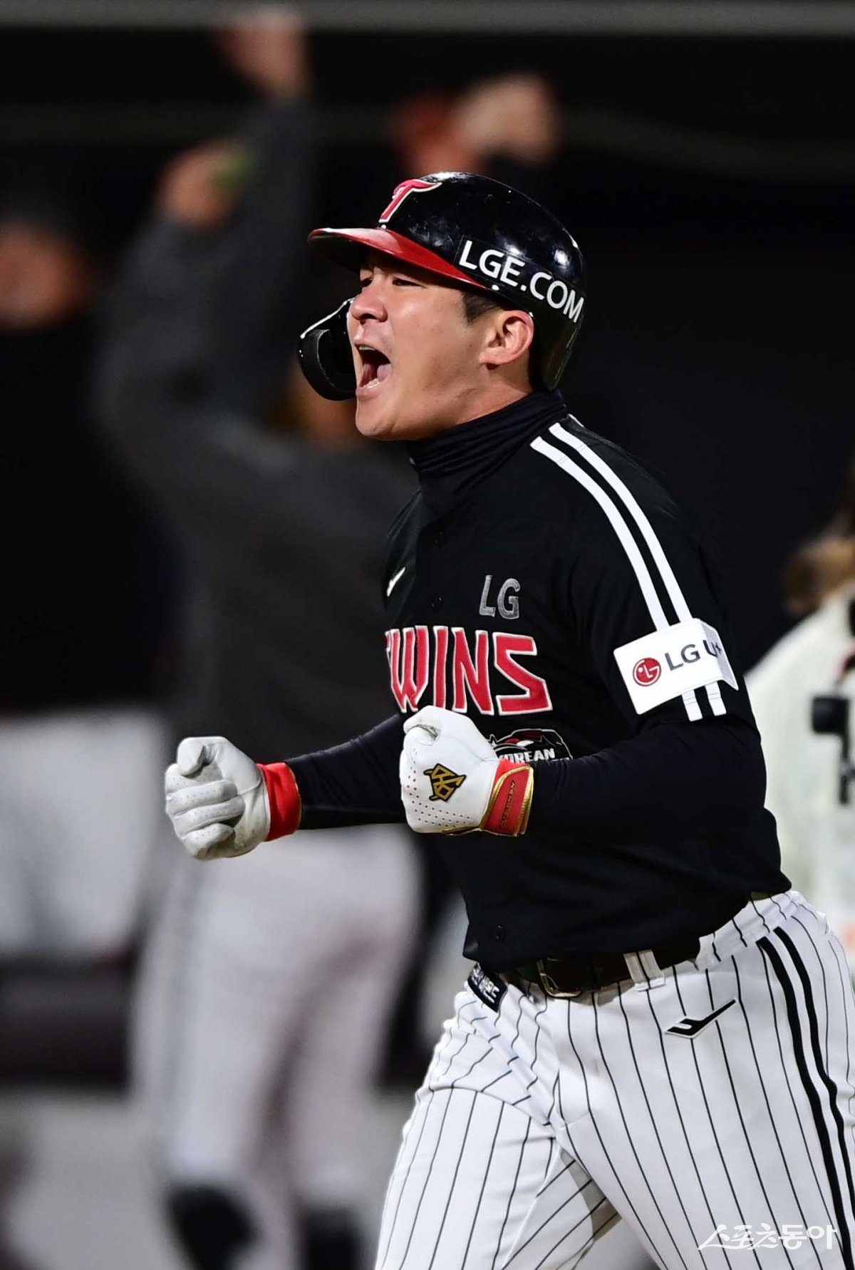 10일 경기도 수원KT위즈파크에서 열린 ‘2023 KBO 포스트시즌’ LG 트윈스와 KT 위즈의 한국시리즈 3차전 경기에서 9회초 2사 1, 2루 LG 오지환이 역전 좌월 3점 홈런을 친 후 포효하고 있다.
