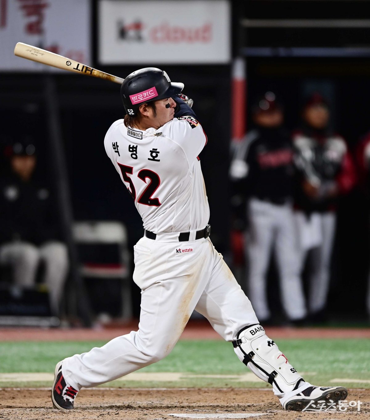 10일 경기도 수원KT위즈파크에서 열린 ‘2023 KBO 포스트시즌’ LG 트윈스와 KT 위즈의 한국시리즈 3차전 경기에서 8회말 1사 2루 KT 박병호가 역전 2점 홈런을 치고 있다.