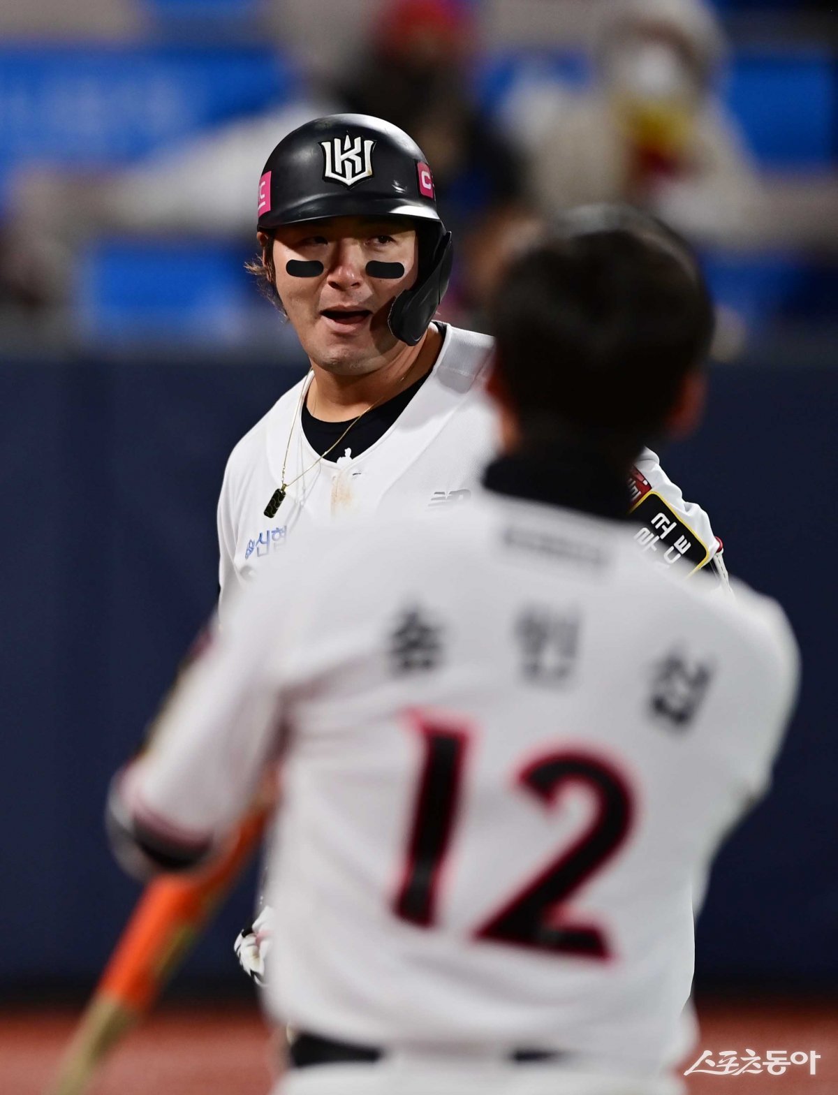 10일 경기도 수원KT위즈파크에서 열린 ‘2023 KBO 포스트시즌’ LG 트윈스와 KT 위즈의 한국시리즈 3차전 경기에서 8회말 1사 2루 KT 박병호가 역전 2점 홈런을 친 후 동료와 기쁨을 나누고 있다.