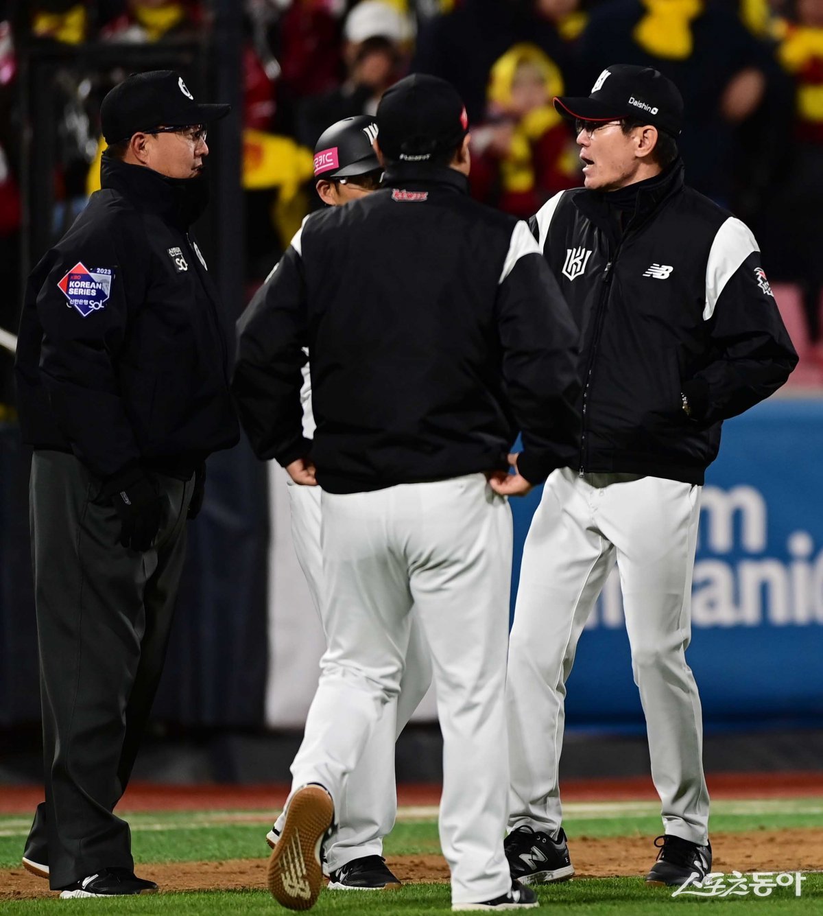 10일 경기도 수원KT위즈파크에서 열린 ‘2023 KBO 포스트시즌’ LG 트윈스와 KT 위즈의 한국시리즈 3차전 경기에서 9회말 1사 KT 이강철 감독이 김준태의 헛스윙 판정에 심판에게 어필하고 있다.