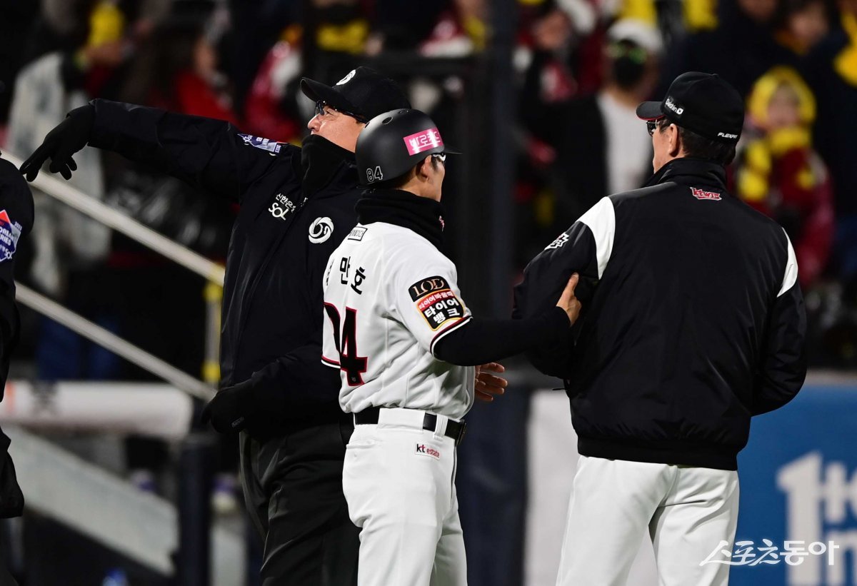 10일 경기도 수원KT위즈파크에서 열린 ‘2023 KBO 포스트시즌’ LG 트윈스와 KT 위즈의 한국시리즈 3차전 경기에서 9회말 1사 KT 이강철 감독이 김준태의 헛스윙 판정에 심판에게 어필하자 퇴장당하고 있다.