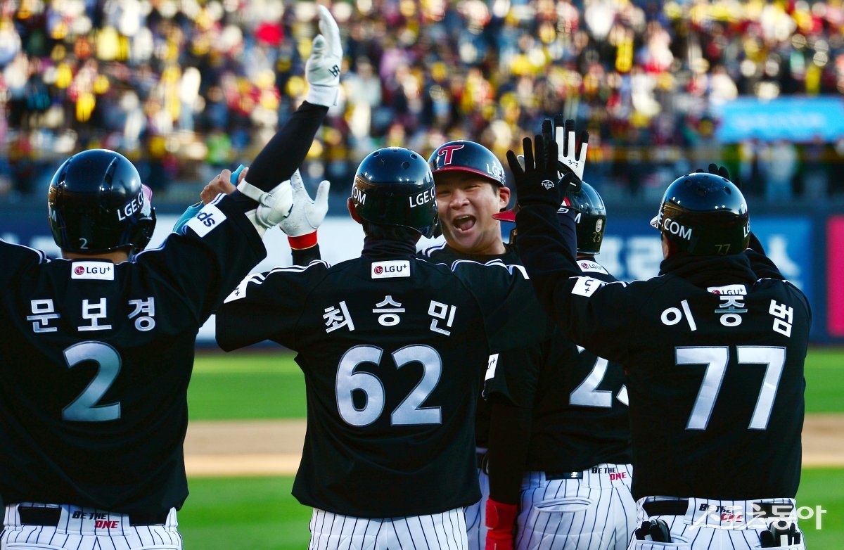 11일 경기도 수원 kt위즈파크에서 ‘2023 신한은행 SOL KBO리그’ LG 트윈스와 kt 위즈의 한국시리즈 4차전 경기가 열렸다. 7회초 1사 1, 3루에서 LG 오지환이 3점 홈런을 쏘아 올린 후 동료들과 기쁨을 나누고 있다.