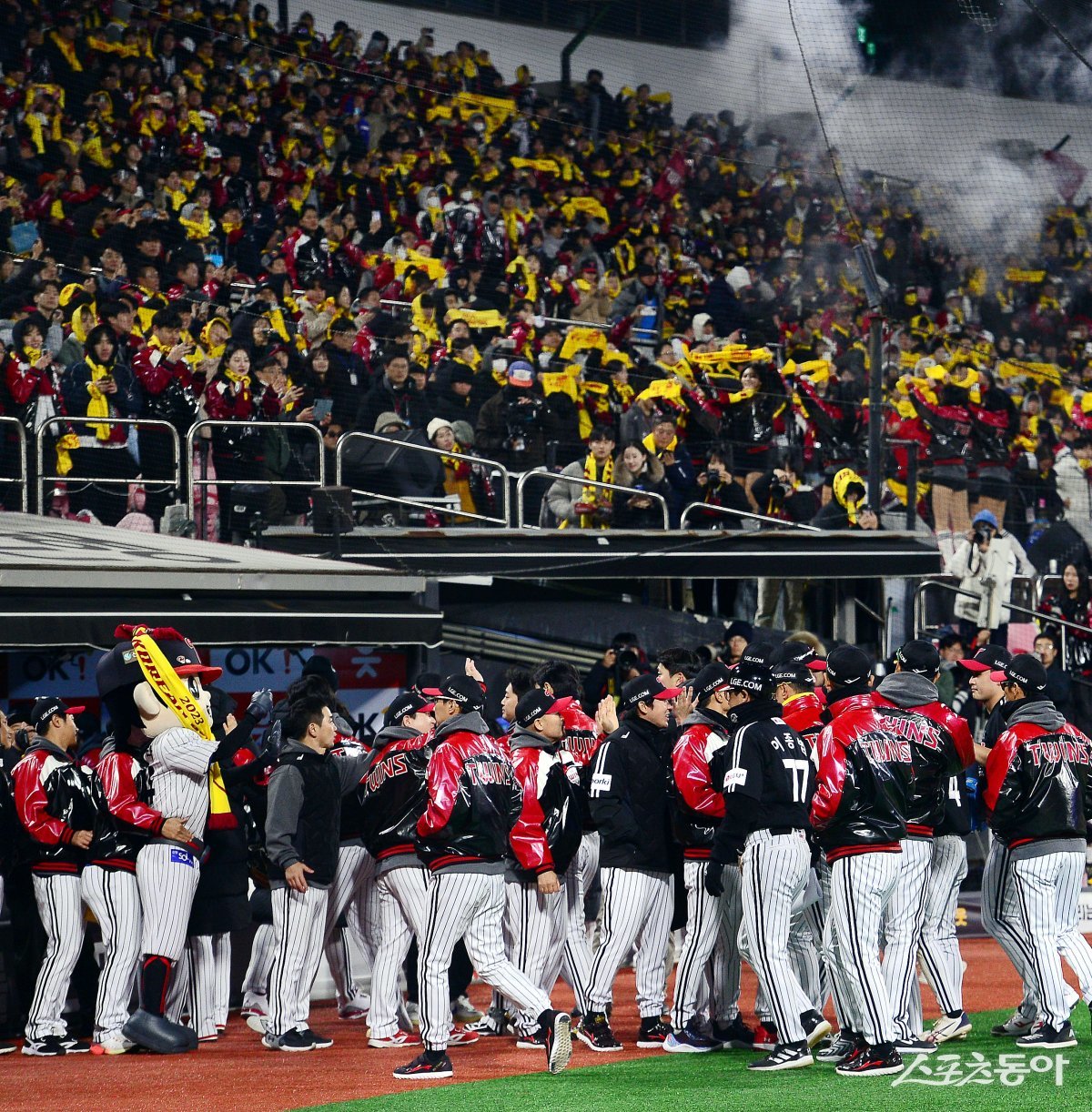 11일 경기도 수원 kt위즈파크에서 ‘2023 신한은행 SOL KBO리그’ LG 트윈스와 kt 위즈의 한국시리즈 4차전 경기가 열렸다. LG가 kt를 상대로 15-4 승리를 거두며 시리즈 3승 1패를 기록한 후 선수들과 코칭스탭들이 기쁨을 나누고 있다.