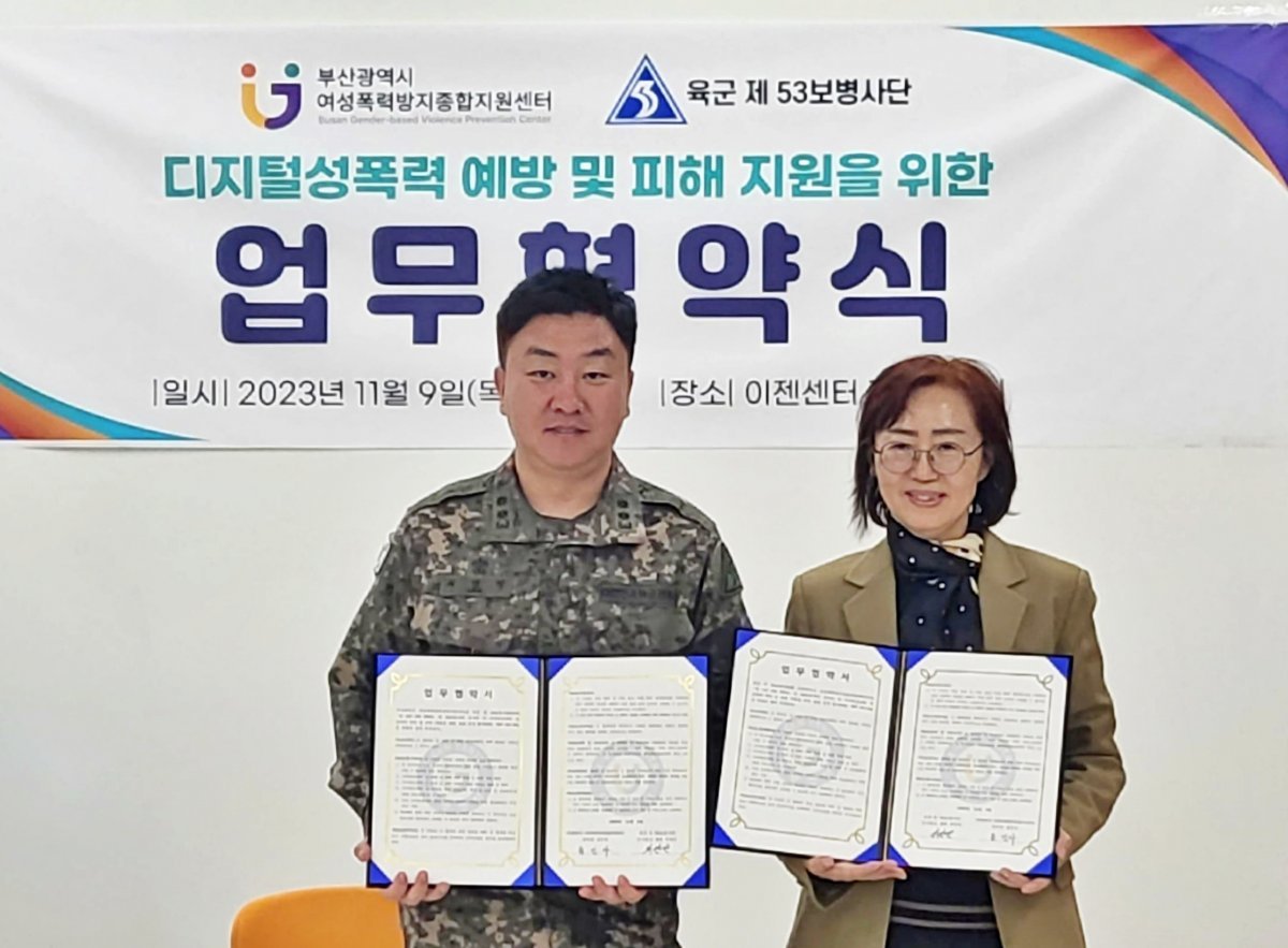 부산시 여성폭력방지종합지원센터(이젠센터, 센터장 송인자)가 육군 제53보병사단과 지난 9일 군부대 내 디지털 성폭력 등 성폭력 예방·피해 지원을 위한 업무협약(MOU)을 체결했다.이젠센터와 육군 제53보병사단은 이번 협약식을 계기로 ▲피해 사례 지원·자원 연계 협력 ▲예방·피해 지원 서비스 공유·연계 ▲예방 위한 프로그램 제공 ▲상호발전 위한 의견¤정보교환 ▲기타 디지털성폭력 등의 방지와 피해자 지원을 위해 필요한 사항을 협력할 예정이다.