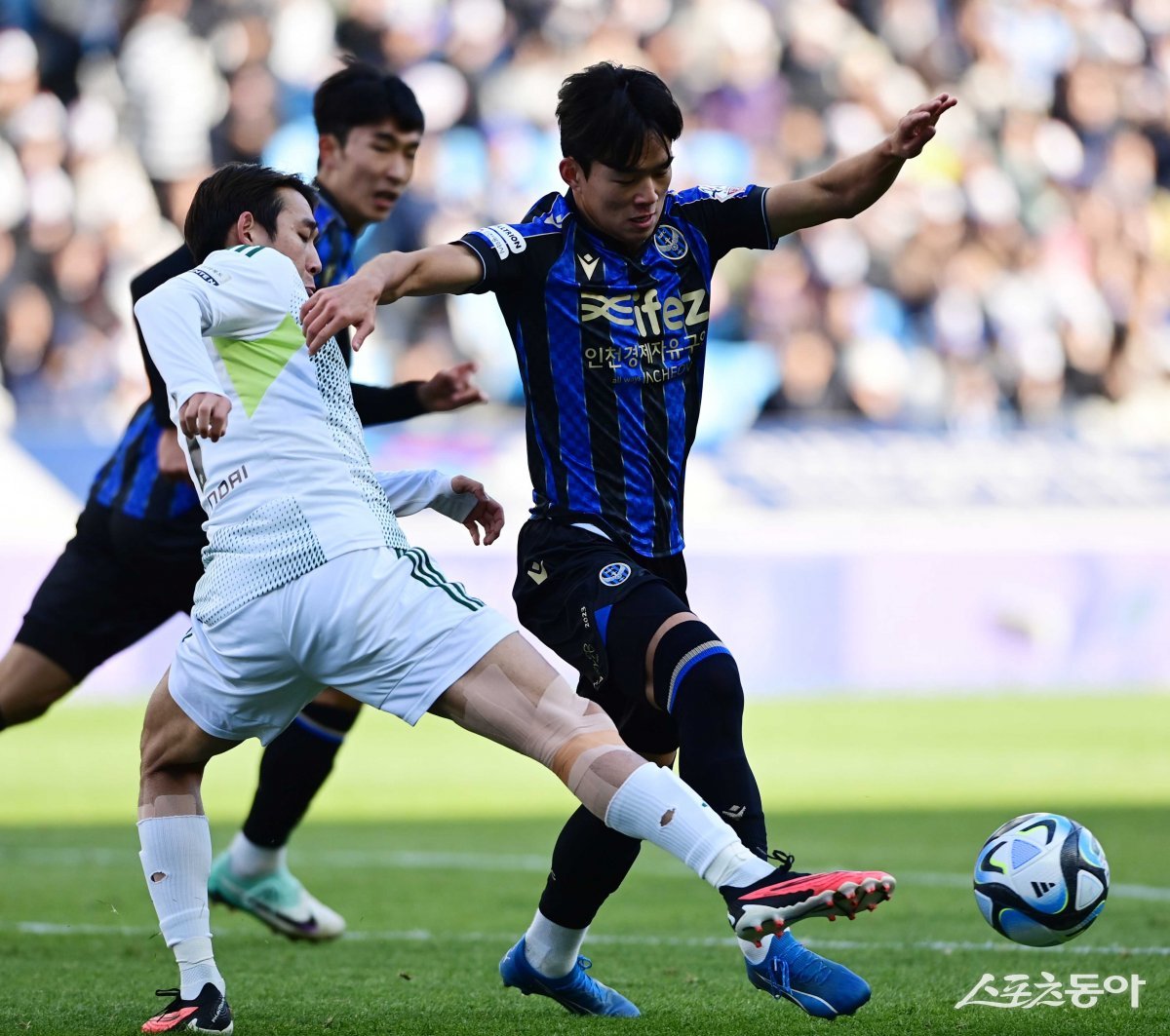 12일 인천축구전용경기장에서 열린 ‘하나원큐 K리그1 2023’ 인천 유나이티드와 전북 현대의 경기에서 전북 송민규가 인천 박승호를 수비하고 있다. 인천 | 주현희 기자 teth1147@donga.com