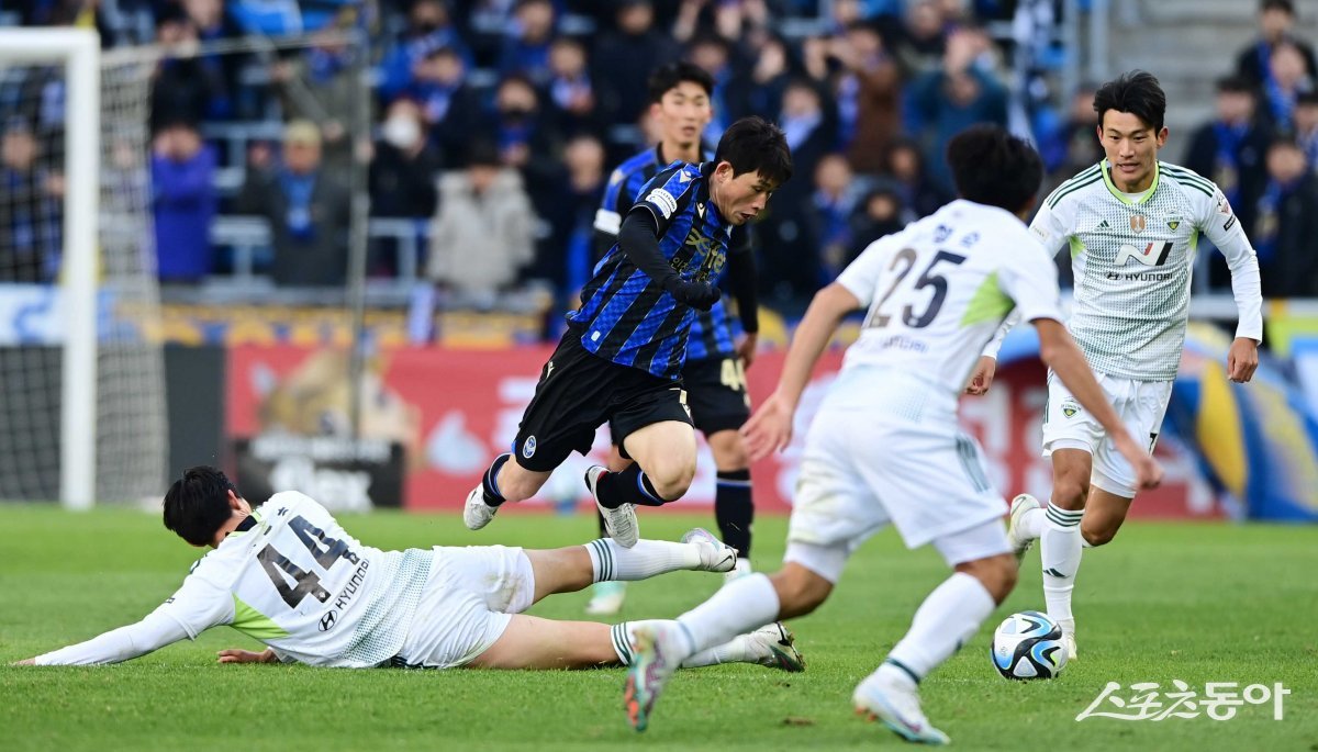 12일 인천축구전용경기장에서 열린 ‘하나원큐 K리그1 2023’ 인천 유나이티드와 전북 현대의 경기에서 인천 김도혁이 전북 수비에 넘어지고 있다. 인천 | 주현희 기자 teth1147@donga.com