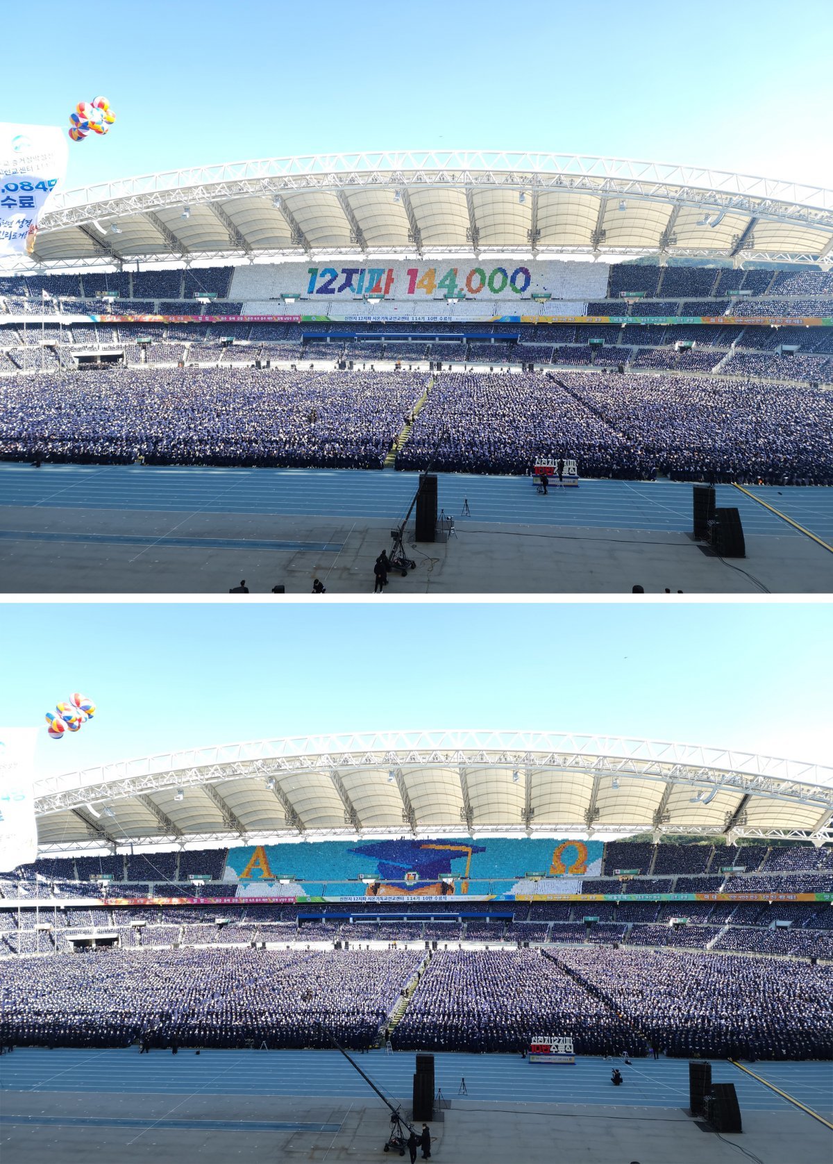 신천지예수교 증거장막성전(총회장 이만희)의 시온기독교선교센터(총원장 탄영진)가 12일 대구스타디움에서 ‘신천지 12지파 시온기독교선교센터 114기 수료식’을 개최한 가운데 하늘 문화 단원들이 카드섹션을 펼치고 있다.