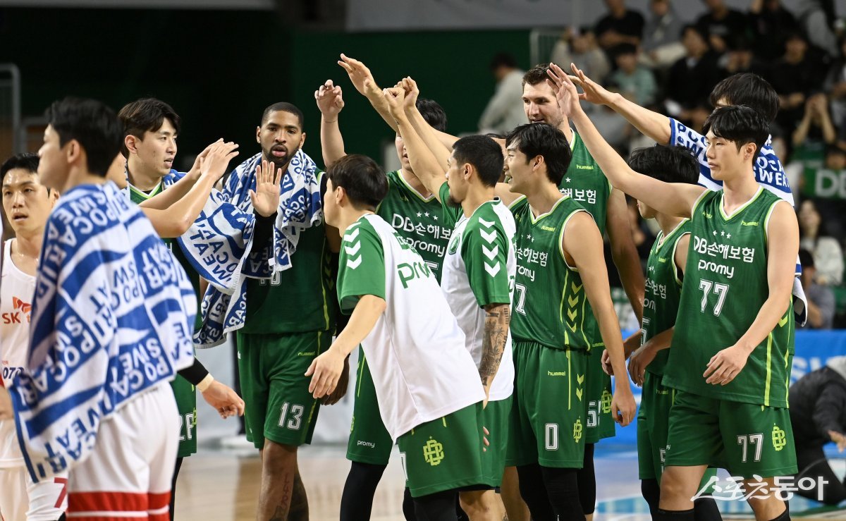12일 원주종합체육관에서 열린 ‘2023-2024 프로농구’ 원주 DB와 서울 SK 경기에서 106-76 대승을 거둔 DB 선수들이 기뻐하고 있다. 원주 | 김종원 기자 won@donga.com