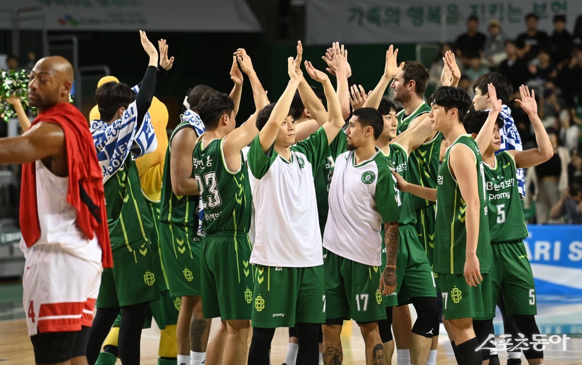 12일 원주종합체육관에서 열린 ‘2023-2024 프로농구’ 원주 DB와 서울 SK 경기에서 106-76 대승을 거둔 DB 선수들이 기뻐하고 있다. 원주 | 김종원 기자 won@donga.com