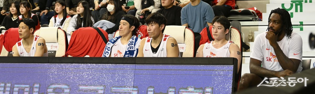 12일 원주종합체육관에서 열린 ‘2023-2024 프로농구’ 원주 DB와 서울 SK 경기에서 4쿼터 SK 김선형, 허일영, 오세근, 최원혁, 워니가 벤치에 앉아있다. 원주 | 김종원 기자 won@donga.com
