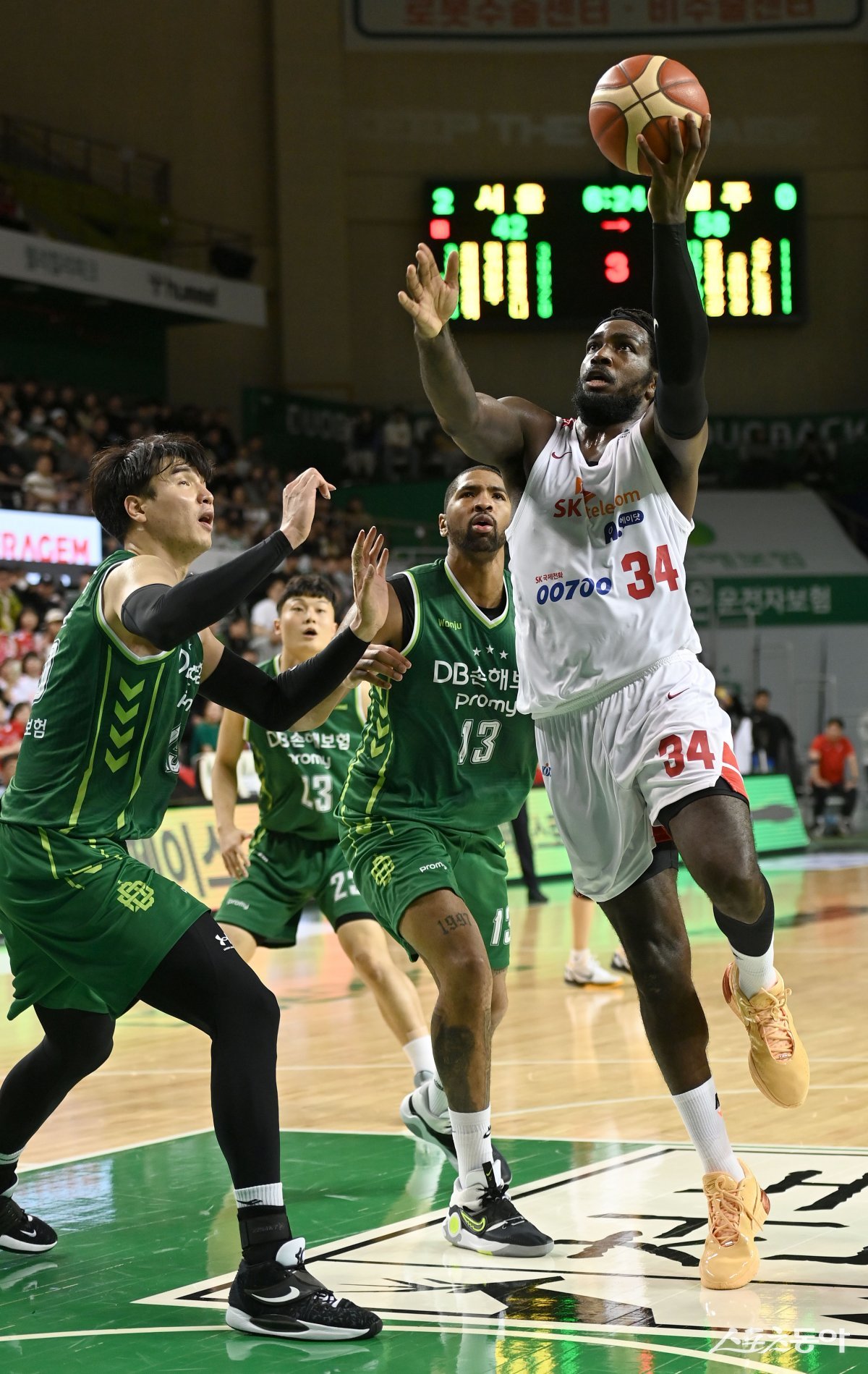 12일 원주종합체육관에서 열린 ‘2023-2024 프로농구’ 원주 DB와 서울 SK 경기에서 SK 워니가 DB의 수비를 뚫고 골밑을 공격하고 있다. 원주 | 김종원 기자 won@donga.com