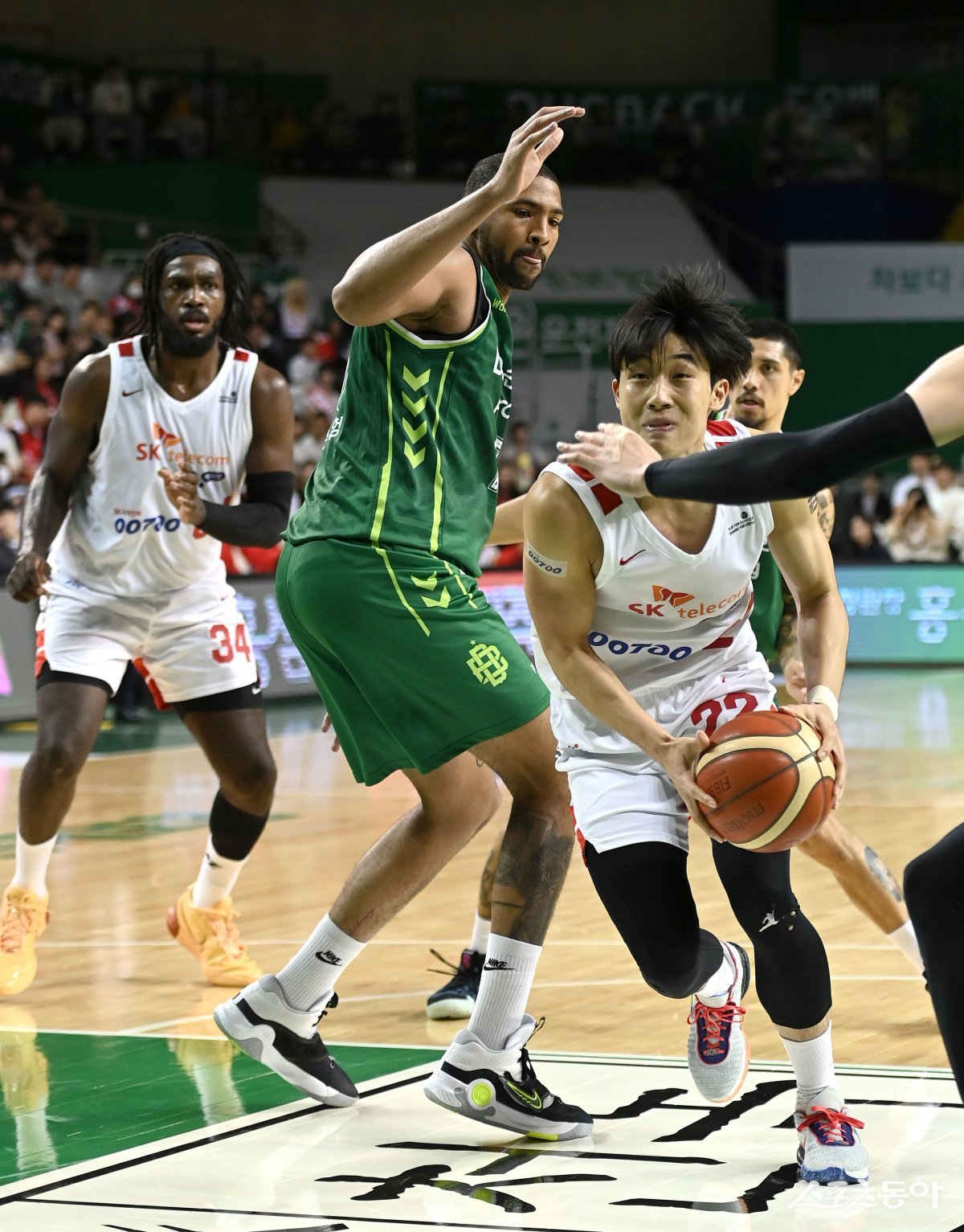 12일 원주종합체육관에서 열린 ‘2023-2024 프로농구’ 원주 DB와 서울 SK 경기에서 SK 오재현이 DB의 수비를 뚫고 골밑을 공격하고 있다. 원주 | 김종원 기자 won@donga.com