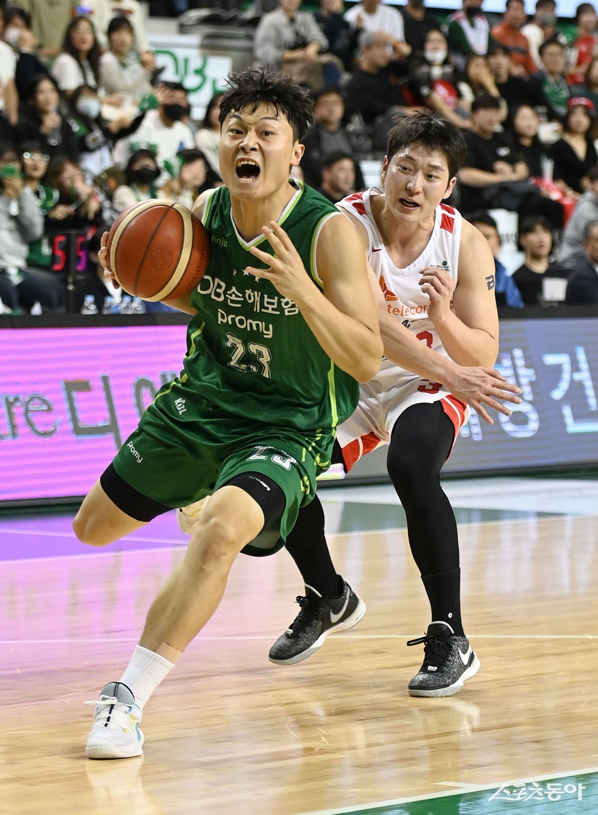12일 원주종합체육관에서 열린 ‘2023-2024 프로농구’ 원주 DB와 서울 SK 경기에서 DB 박인웅이 SK의 수비를 뚫고 골밑을 공격하고 있다. 원주 | 김종원 기자 won@donga.com