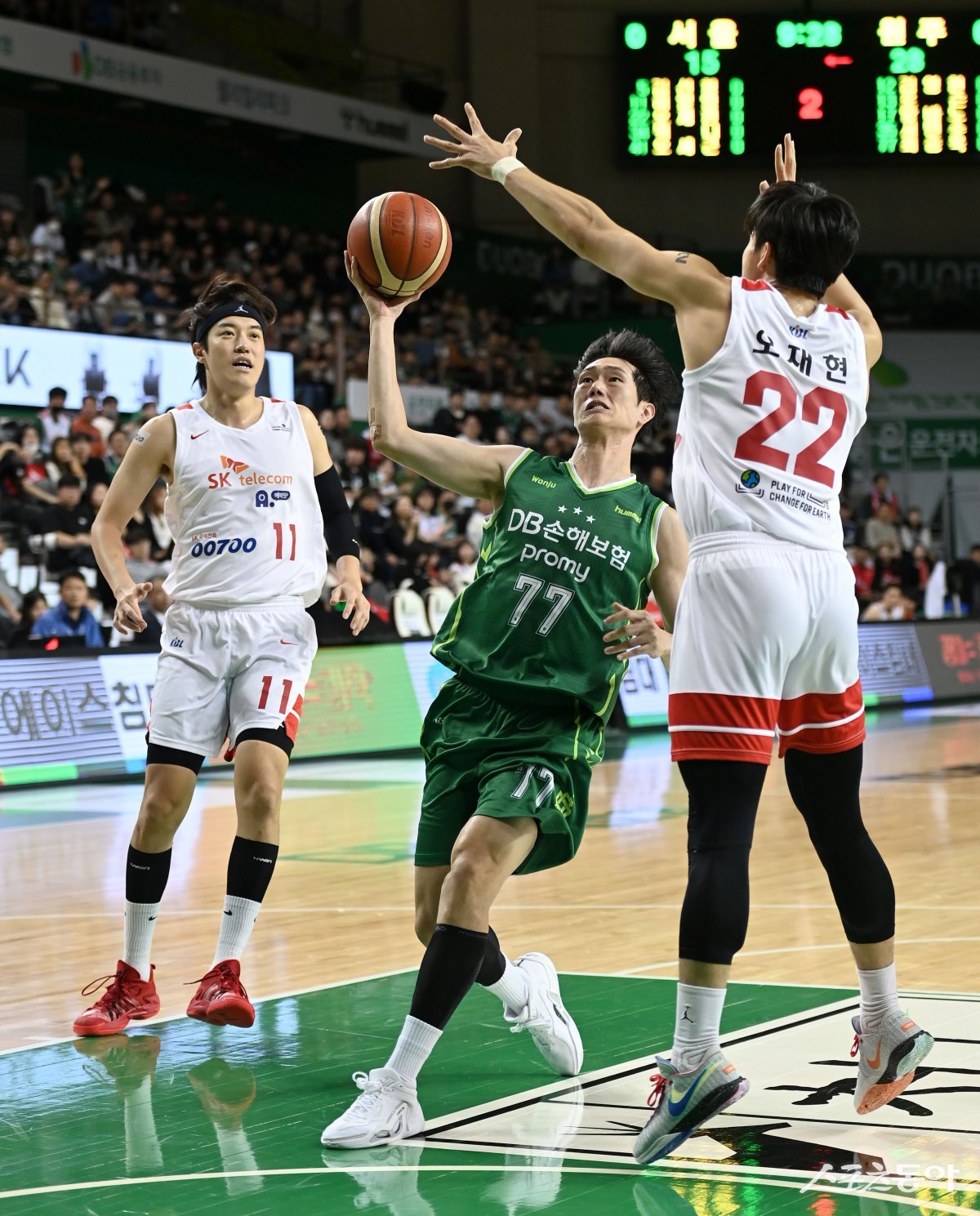 12일 원주종합체육관에서 열린 ‘2023-2024 프로농구’ 원주 DB와 서울 SK 경기에서 DB 최승욱이 SK의 수비를 뚫고 골밑을 공격하고 있다. 원주 | 김종원 기자 won@donga.com