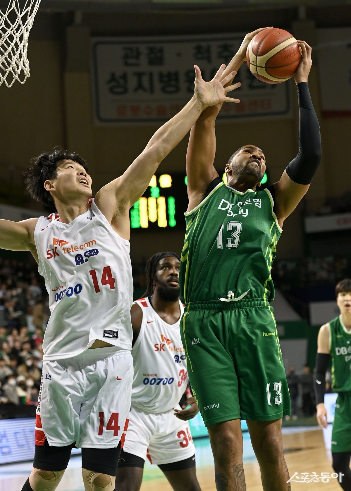 12일 원주종합체육관에서 열린 ‘2023-2024 프로농구’ 원주 DB와 서울 SK 경기에서 DB 로슨이 리바운드 볼을 잡고 있다. 원주 | 김종원 기자 won@donga.com