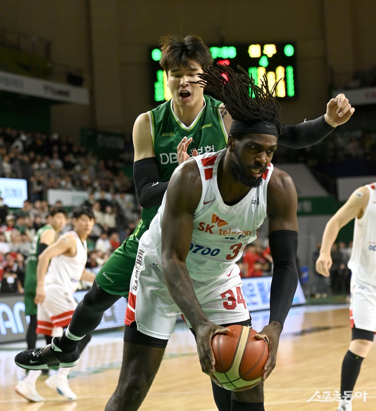 12일 원주종합체육관에서 열린 ‘2023-2024 프로농구’ 원주 DB와 서울 SK 경기에서 SK 워니가 DB 김종규에 앞서 리바운드 볼을 잡고 있다. 원주 | 김종원 기자 won@donga.com