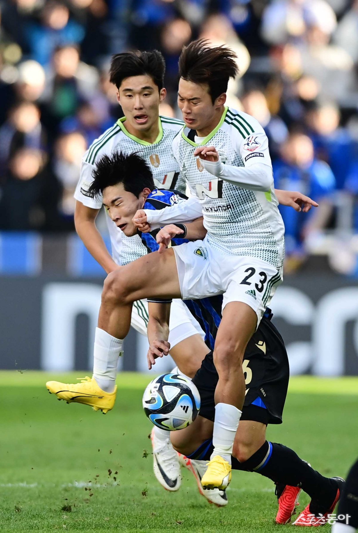 12일 인천축구전용경기장에서 열린 ‘하나원큐 K리그1 2023’ 인천 유나이티드와 전북 현대의 경기에서 인천 박현빈과 전북 김진수가 몸싸움 과정에서 충돌하고 있다. 인천 | 주현희 기자 teth1147@donga.com