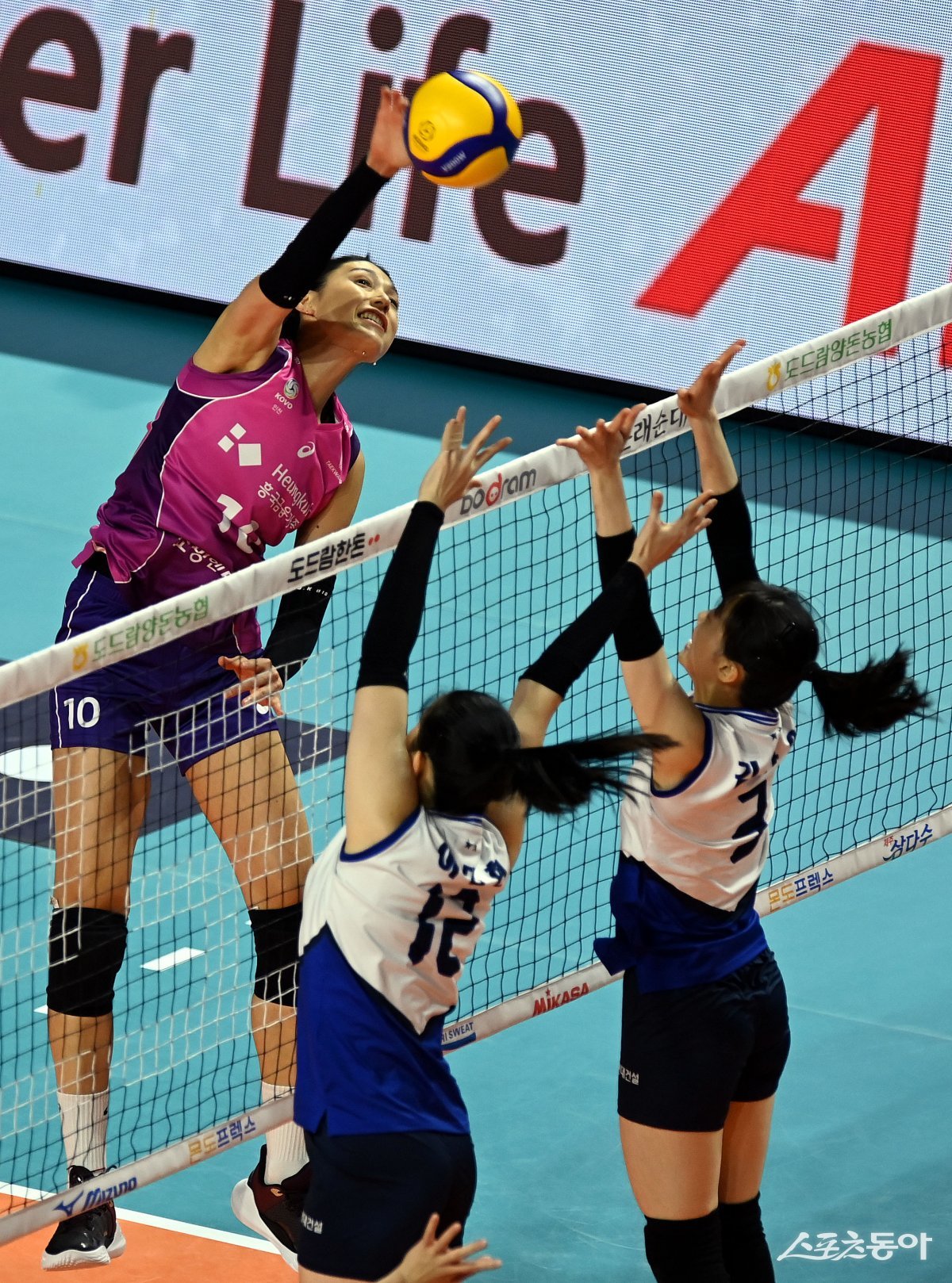 12일 인천 삼산월드체육관에서 ‘2023-2024 도드람 V리그’ 인천 흥국생명과 수원 현대건설의 여자부 경기가 열렸다. 흥국생명 김연경이 현대건설 블로커를 피해 스파이크를 날리고 있다. 인천 | 김민성 기자 marineboy@donga.com