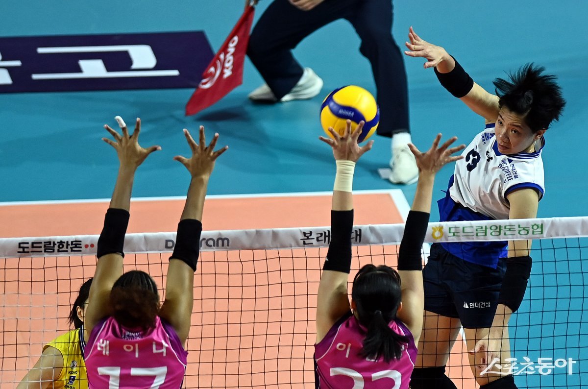 12일 인천 삼산월드체육관에서 ‘2023-2024 도드람 V리그’ 인천 흥국생명과 수원 현대건설의 여자부 경기가 열렸다. 현대건설 위파위가 흥국생명 블로커를 피해 스파이크를 날리고 있다. 인천 | 김민성 기자 marineboy@donga.com