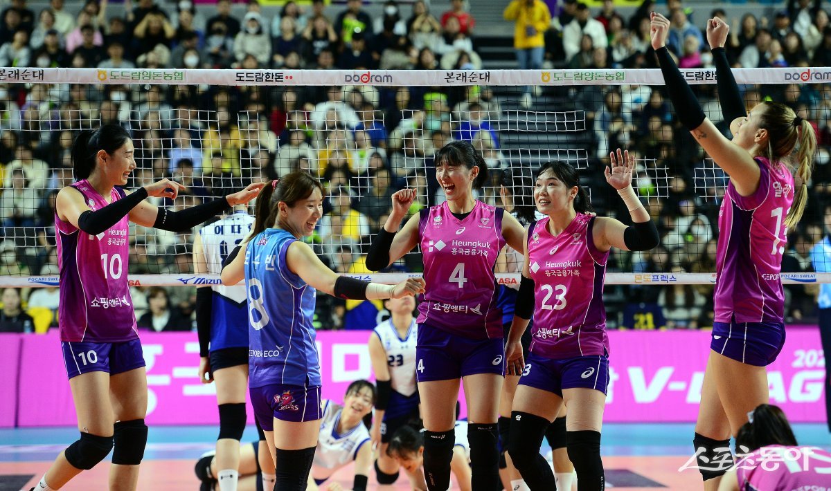 12일 인천 삼산월드체육관에서 ‘2023-2024 도드람 V리그’ 인천 흥국생명과 수원 현대건설의 여자부 경기가 열렸다. 흥국생명이 현대건설을 상대로 세트스코어 3-2 승리한 후 선수들이 코트에서 기쁨을 나누고 있다. 인천 | 김민성 기자 marineboy@donga.com