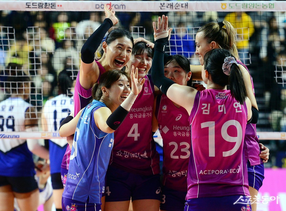 12일 인천 삼산월드체육관에서 ‘2023-2024 도드람 V리그’ 인천 흥국생명과 수원 현대건설의 여자부 경기가 열렸다. 흥국생명이 현대건설을 상대로 세트스코어 3-2 승리한 후 선수들이 코트에서 기쁨을 나누고 있다. 인천 | 김민성 기자 marineboy@donga.com