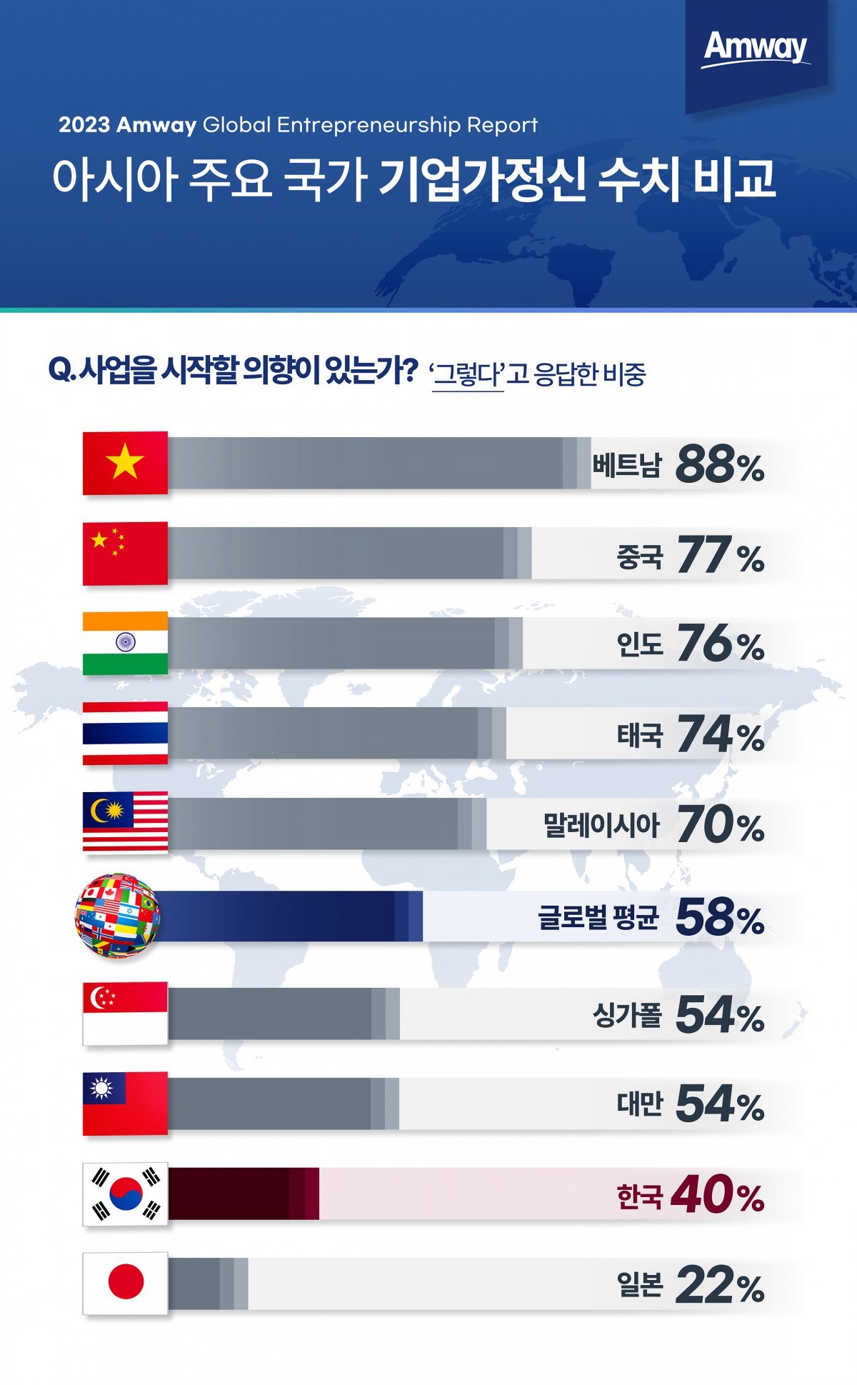 암웨이는 세계기업가정신주간(11월 13~19일)을 맞아 13일 ‘2023 암웨이 글로벌 기업가정신 보고서’의 주요 결과를 발표했다. 올해는 전 세계 15개국 성인 1만5000여 명을 대상으로 조사를 진행했다.