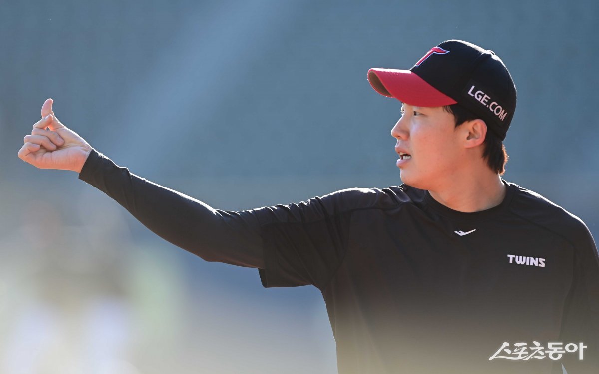 13일 서울 잠실야구장에서 열린 ‘2023 KBO 포스트시즌’ KT 위즈와 LG 트윈스의 한국시리즈 5차전 경기에 앞서 LG 임찬규가 동료를 향해 하트를 만들고 있다.