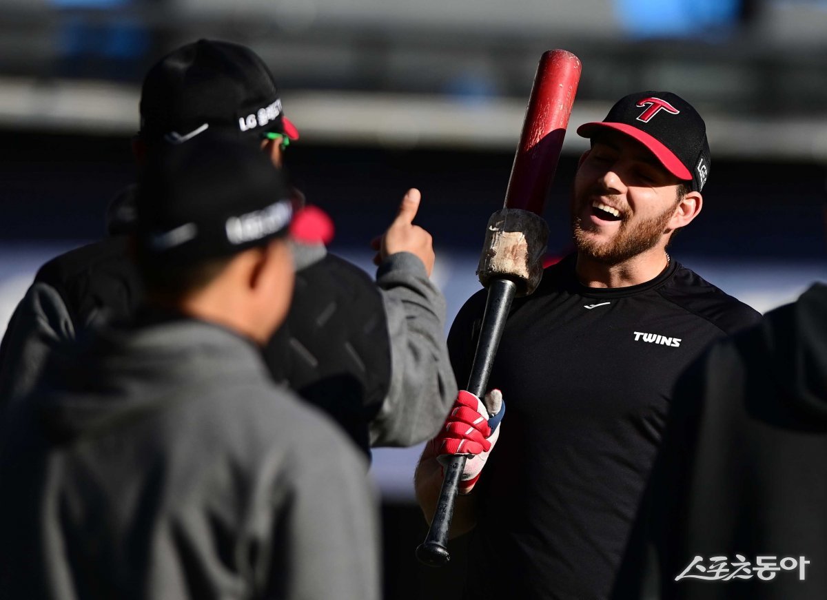 13일 서울 잠실야구장에서 열린 ‘2023 KBO 포스트시즌’ KT 위즈와 LG 트윈스의 한국시리즈 5차전 경기에 앞서 LG 오스틴이 코치와 이야기하며 웃고 있다.