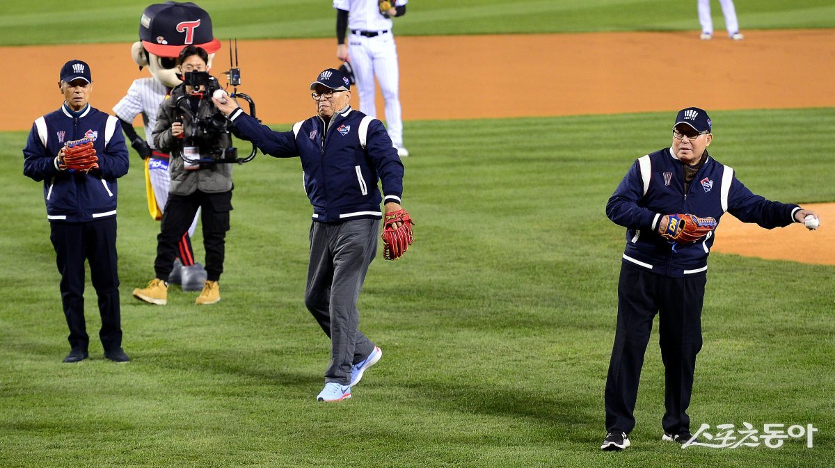 13일 서울 잠실야구장에서 ‘2023 신한은행 SOL KBO리그’ LG 트윈스와 kt 위즤의 한국시리즈 5차전 경기가 열렸다. 김성근 감독, 김응용 감독, 김인식 감독이 시구를 던지고 있다. 잠실 | 김민성 기자 marineboy@donga.com