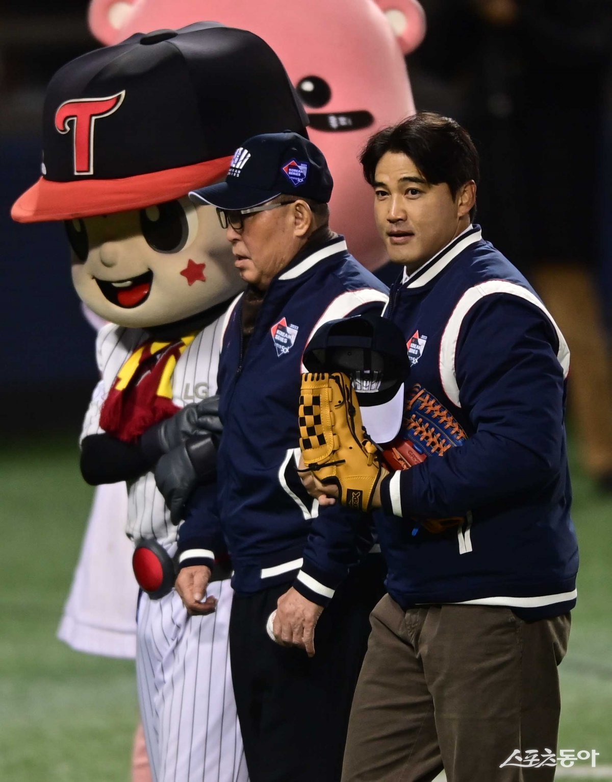 13일 서울 잠실야구장에서 열린 ‘2023 KBO 포스트시즌’ KT 위즈와 LG 트윈스의 한국시리즈 5차전 경기에 앞서 김인식 감독과 홍성흔이 시구와 시포를 마친 후 함께 그라운드를 지나고 있다. 잠실 | 주현희 기자 teth1147@donga.com