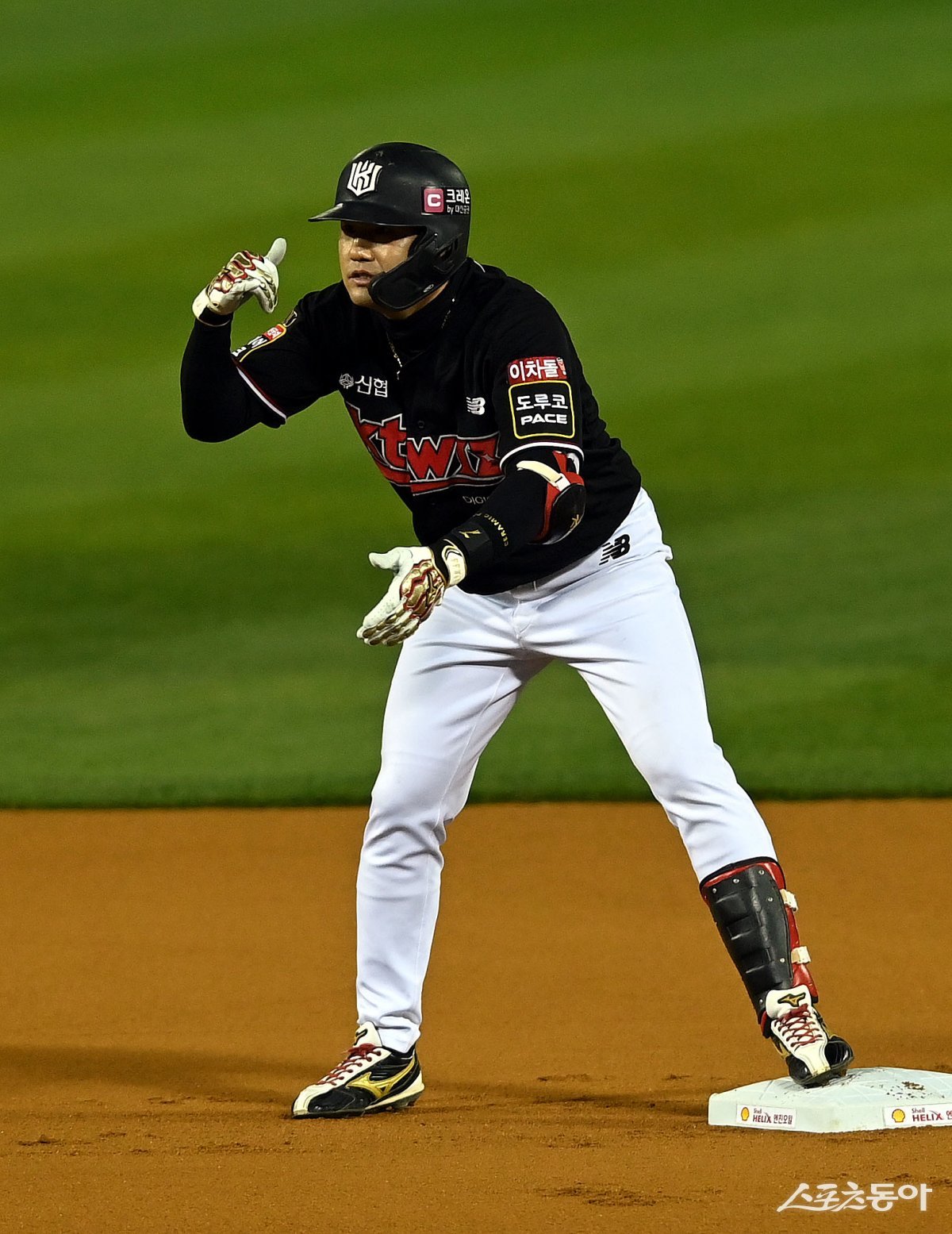 13일 서울 잠실야구장에서 ‘2023 신한은행 SOL KBO리그’ LG 트윈스와 kt 위즤의 한국시리즈 5차전 경기가 열렸다. 1회초 1사 1루에서 kt 김상수가 안타 후 실책으로 2루까지 진루해 세리머니를 펼치고 있다. 잠실 | 김민성 기자 marineboy@donga.com