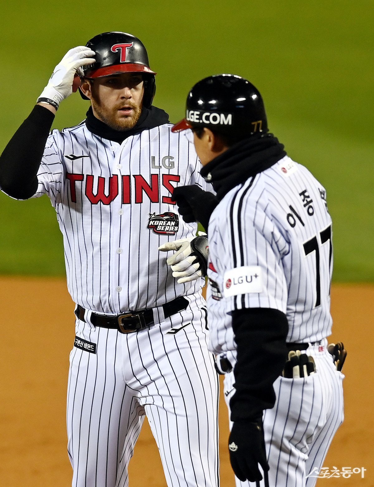 13일 서울 잠실야구장에서 ‘2023 신한은행 SOL KBO리그’ LG 트윈스와 kt 위즤의 한국시리즈 5차전 경기가 열렸다. 2회말 무사에서 LG 오스틴이 안타를 날린 후 환호하고 있다. 잠실 | 김민성 기자 marineboy@donga.com