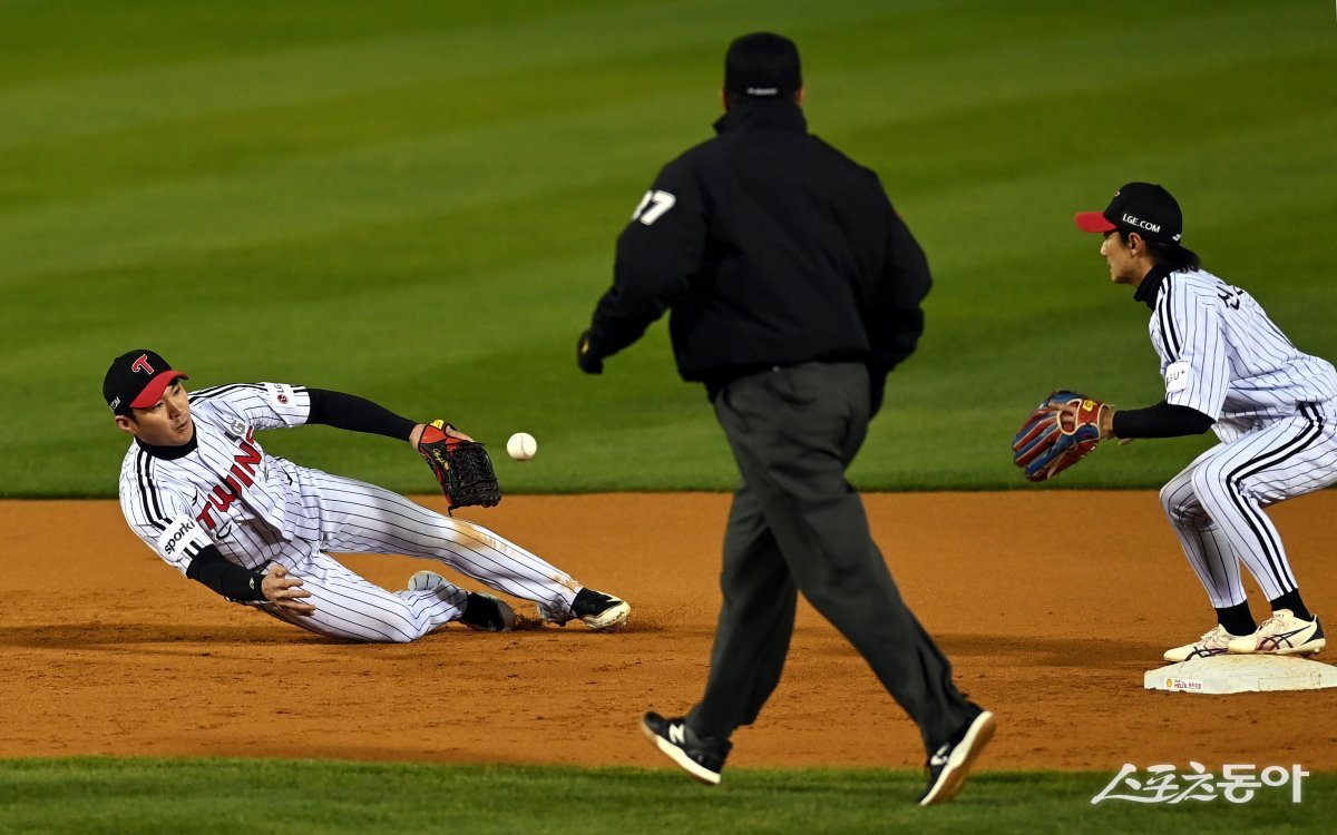 13일 서울 잠실야구장에서 ‘2023 신한은행 SOL KBO리그’ LG 트윈스와 kt 위즤의 한국시리즈 5차전 경기가 열렸다. 4회초 1사 1루에서 내야땅볼 때 LG 오지환이 타구를 잡은 후 2루로 송구하고 있다.