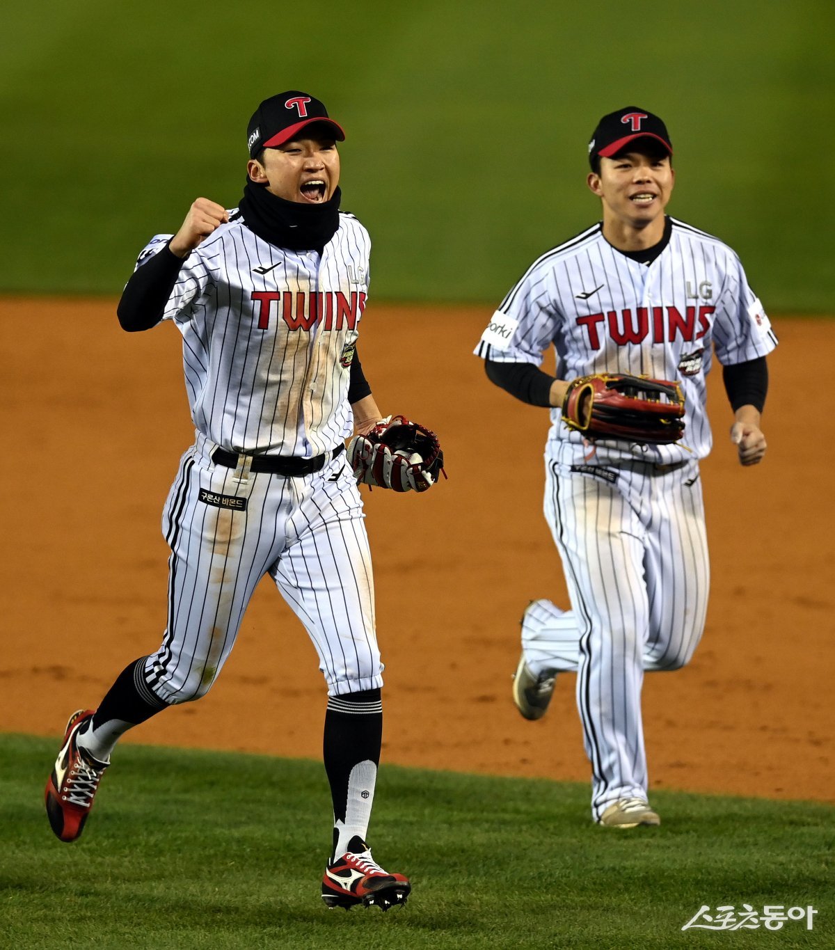13일 서울 잠실야구장에서 ‘2023 신한은행 SOL KBO리그’ LG 트윈스와 kt 위즤의 한국시리즈 5차전 경기가 열렸다. 4회초 2사 1, 2루에서 호수비를 펼친 LG 박해민이 이닝 종료 후 환호하고 있다.