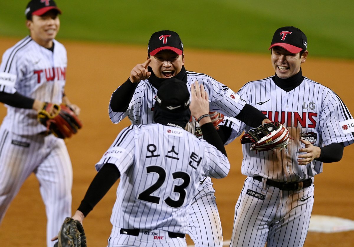 13일 서울 잠실야구장에서 ‘2023 신한은행 SOL KBO리그’ LG 트윈스와 kt 위즤의 한국시리즈 5차전 경기가 열렸다. 4회초 2사 1, 2루에서 호수비를 펼친 LG 박해민이 이닝 종료 후 동료들과 기쁨을 나누고 있다.