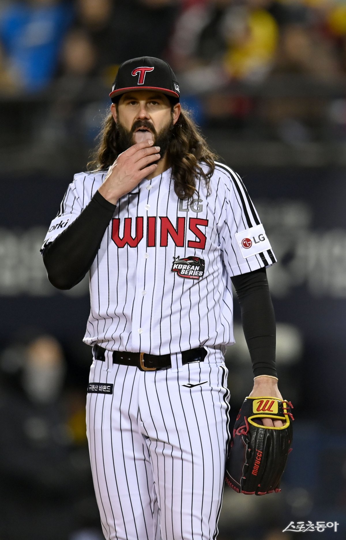 13일 서울 잠실야구장에서 ‘2023 신한은행 SOL KBO리그’ 포스트시즌 한국시리즈 5차전 KT 위즈와 LG 트윈스 경기가 열렸다. LG 선발 켈리가 5회초 2사 1,3루 상황에서 폭투로 실점한 후 아쉬워하고 있다.
