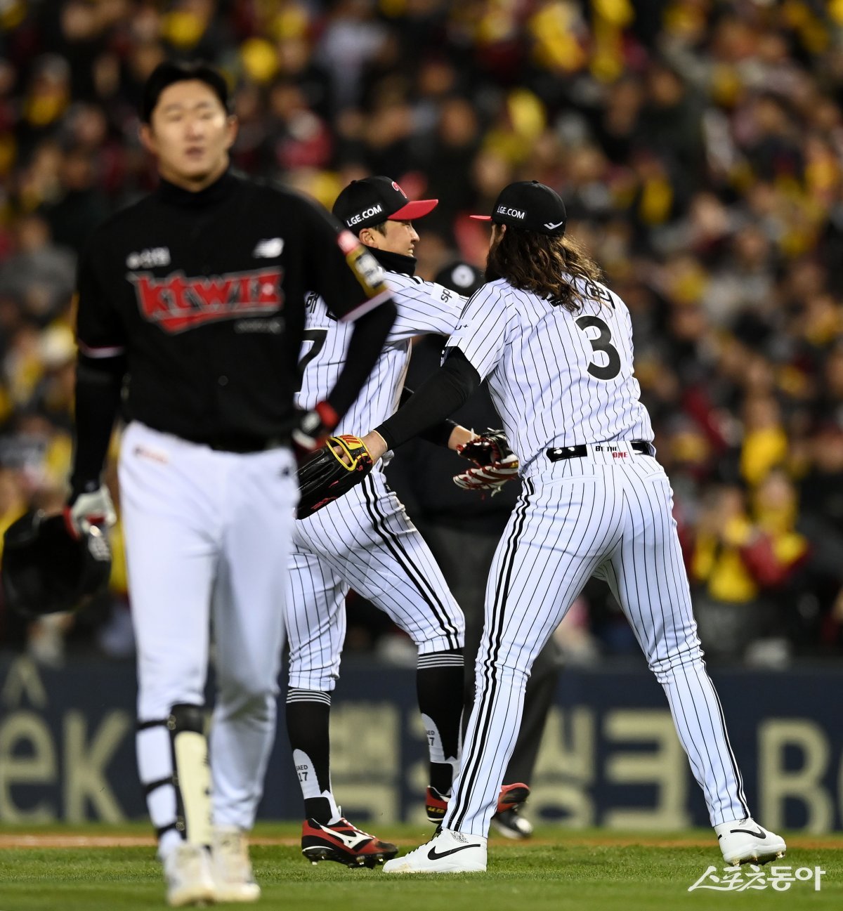 13일 서울 잠실야구장에서 ‘2023 신한은행 SOL KBO리그’ 포스트시즌 한국시리즈 5차전 KT 위즈와 LG 트윈스 경기가 열렸다. 4회초 2사 1,2루 KT 김민혁 외야 뜬공 때 LG 박해민이 다이빙캐치로 이닝을 종료시키 후 환호하고 있다.