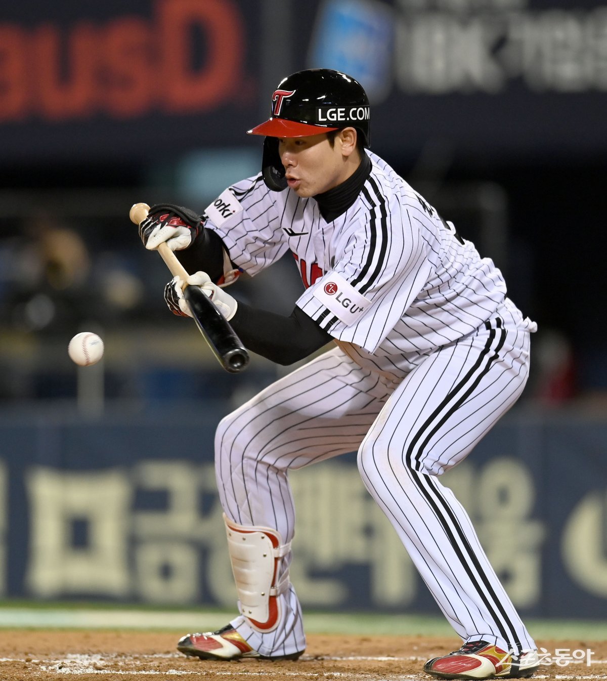 13일 서울 잠실야구장에서 ‘2023 신한은행 SOL KBO리그’ 포스트시즌 한국시리즈 5차전 KT 위즈와 LG 트윈스 경기가 열렸다. 3회말 무사 1,2루 LG 홍창기가 보내기번트를 성공시키고 있다.