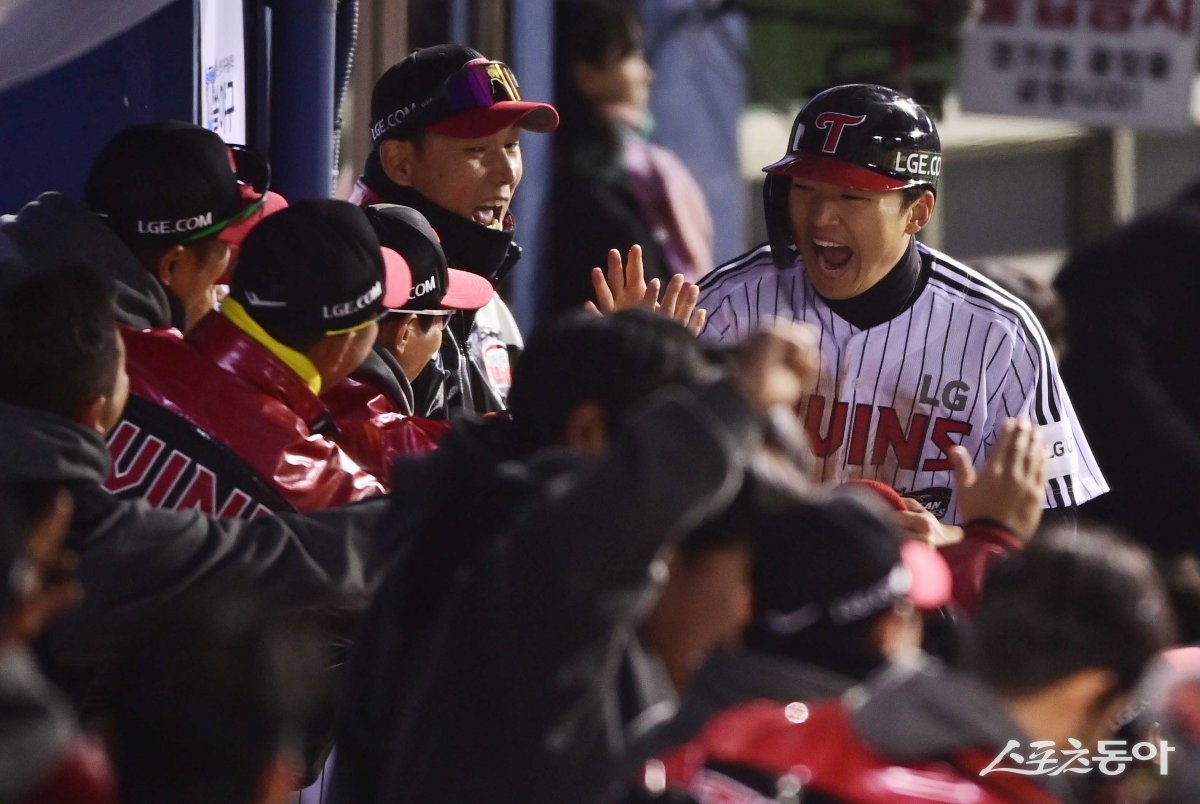 13일 서울 잠실야구장에서 열린 ‘2023 KBO 포스트시즌’ KT 위즈와 LG 트윈스의 한국시리즈 5차전 경기에서 3회말 1사 3루 LG에 땅볼 때 득점에 성공한 3루주자 박해민이 더그아웃에서 코치들과 기쁨을 나누고 있다.