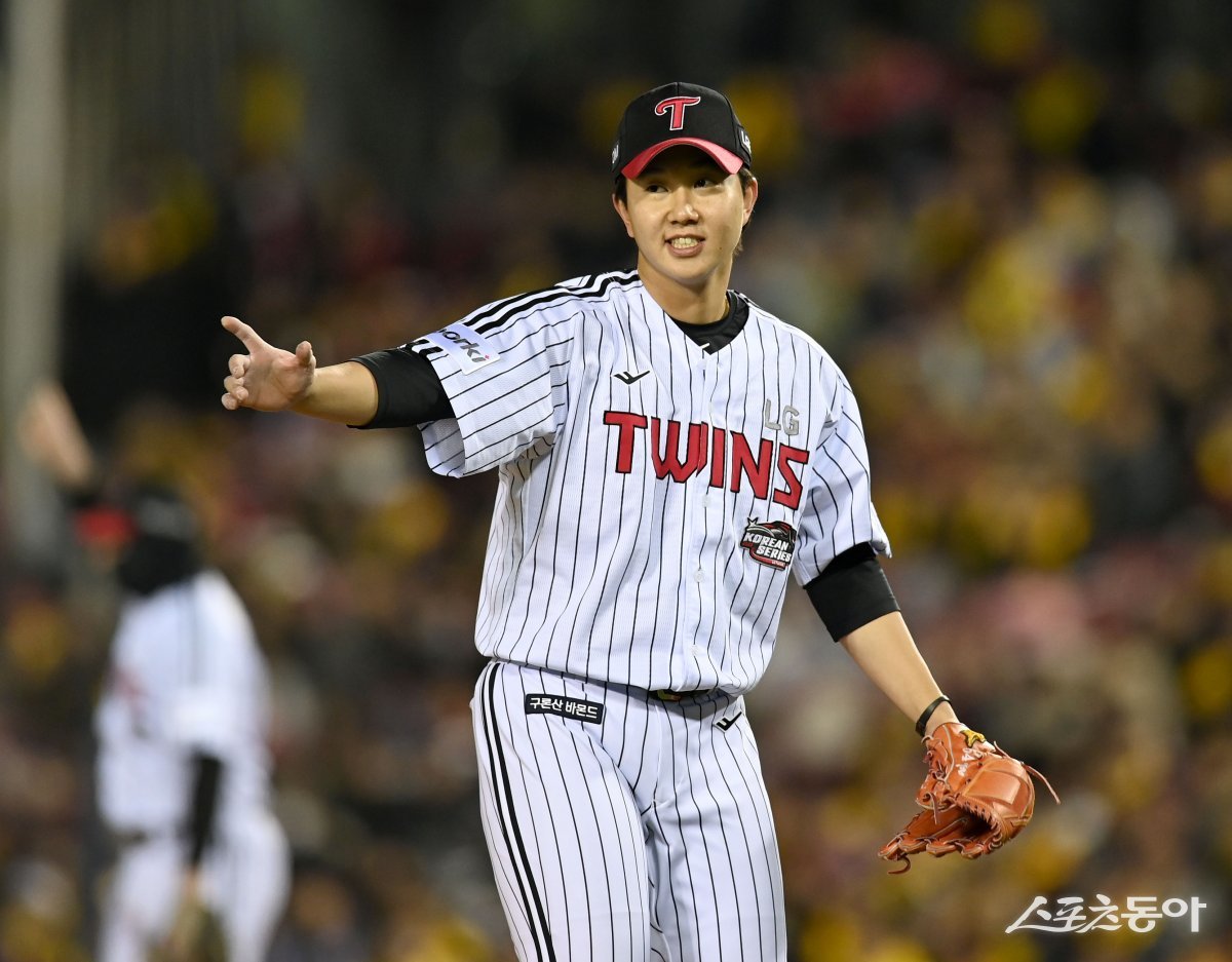 13일 서울 잠실야구장에서 ‘2023 신한은행 SOL KBO리그’ 포스트시즌 한국시리즈 5차전 KT 위즈와 LG 트윈스 경기가 열렸다. 6회초 1사 LG 유형찬이 KT 알포드를 삼진아웃시킨 후 웃고 있다. 잠실 | 김종원 기자 won@donga.com