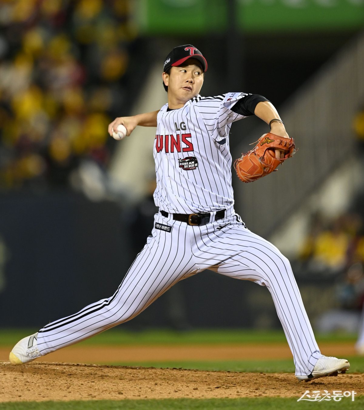13일 서울 잠실야구장에서 ‘2023 신한은행 SOL KBO리그’ 포스트시즌 한국시리즈 5차전 KT 위즈와 LG 트윈스 경기가 열렸다. 6회초 등판한 LG 유영찬이 역투하고 있다. 잠실 | 김종원 기자 won@donga.com