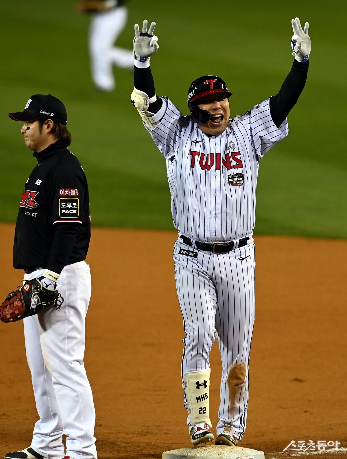 13일 서울 잠실야구장에서 ‘2023 신한은행 SOL KBO리그’ LG 트윈스와 kt 위즤의 한국시리즈 5차전 경기가 열렸다. 5회말 무사 2, 3루에서 LG 김현수가 2타점 적시타를 날린 후 환호하고 있다. 잠실 | 김민성 기자 marineboy@donga.com