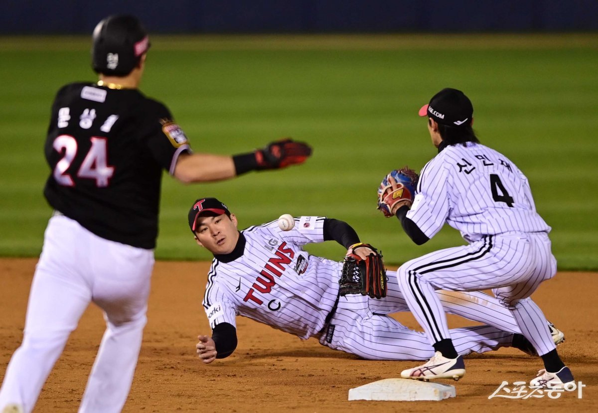 13일 서울 잠실야구장에서 열린 ‘2023 KBO 포스트시즌’ KT 위즈와 LG 트윈스의 한국시리즈 5차전 경기에서 4회초 1사 1루 KT에 땅볼 때 LG 오지환이 넘어지며 2루수에게 볼을 던지고 있다.