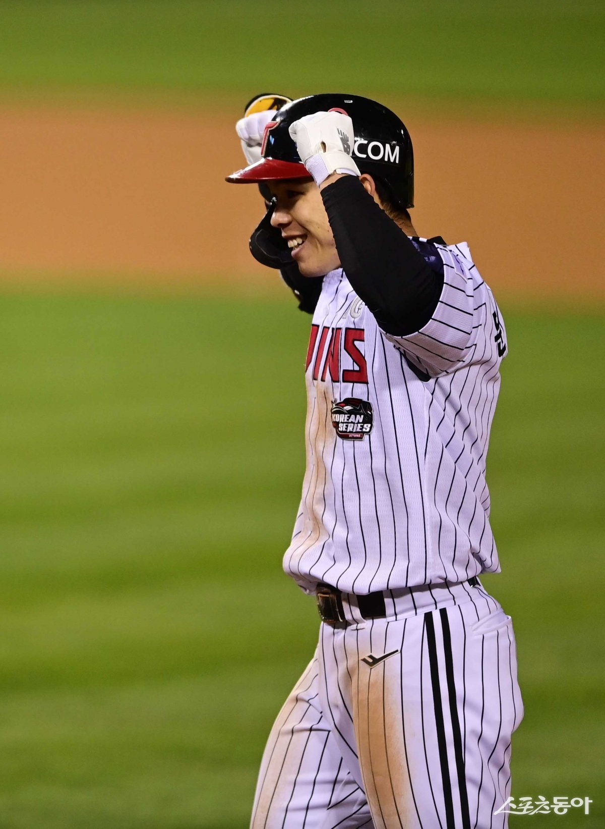 13일 서울 잠실야구장에서 열린 ‘2023 KBO 포스트시즌’ KT 위즈와 LG 트윈스의 한국시리즈 5차전 경기에서 6회말 2사 3루 LG 문성주가 1타점 우전 적시타를 친 후 세리머니를 하고 있다. 잠실 | 주현희 기자 teth1147@donga.com