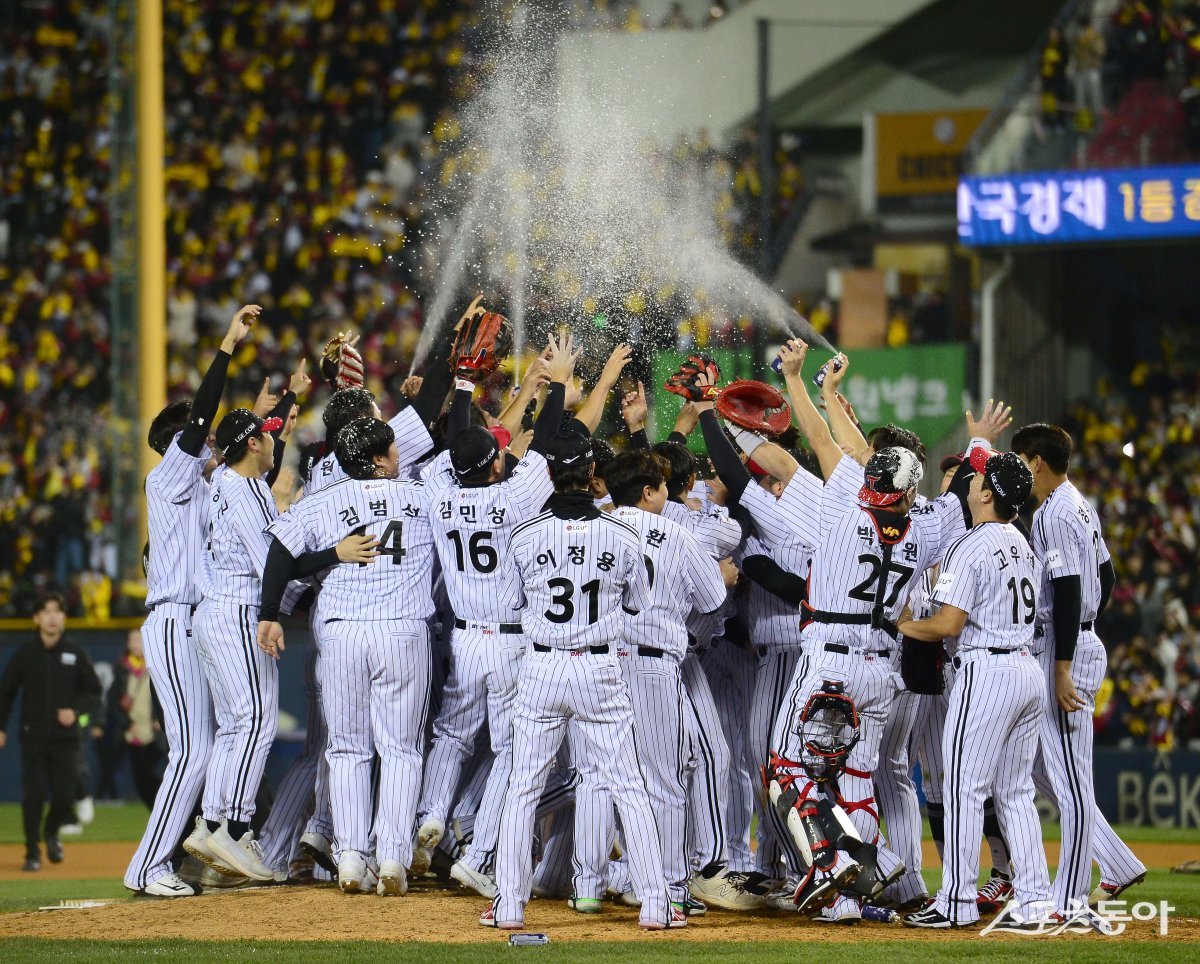 13일 서울 잠실야구장에서 ‘2023 신한은행 SOL KBO리그’ 포스트시즌 한국시리즈 5차전 KT 위즈와 LG 트윈스 경기가 열렸다. 6-2 승리를 거두며 한국시리즈 전적 4승 1패로 우승한 LG 선수들이 환호하고 있다.