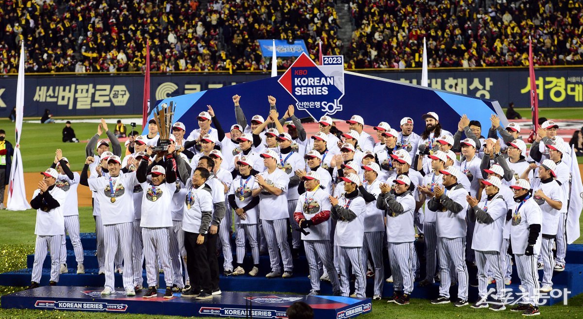 13일 서울 잠실야구장에서 ‘2023 신한은행 SOL KBO리그’ LG 트윈스와 kt 위즤의 한국시리즈 5차전 경기가 열렸다. LG가 kt를 꺾고 29년 만의 한국시리즈 우승을 차지한 후 우승 트로피를 들고 기념촬영을 하고 있다.