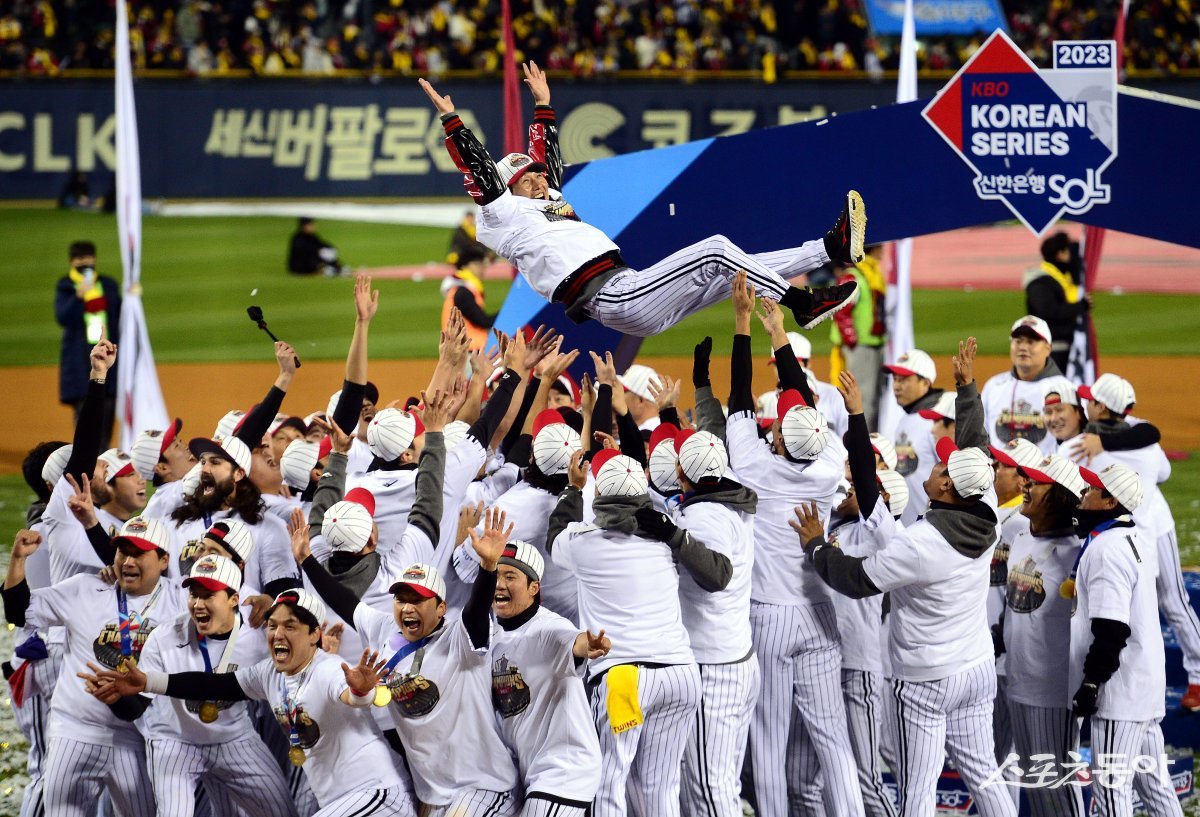 13일 서울 잠실야구장에서 ‘2023 신한은행 SOL KBO리그’ LG 트윈스와 kt 위즤의 한국시리즈 5차전 경기가 열렸다. LG가 kt를 꺾고 29년 만의 한국시리즈 우승을 차지한 후 염경엽 감독이 우승 헹가래를 받고 있다. 잠실 | 김민성 기자 marineboy@donga.com