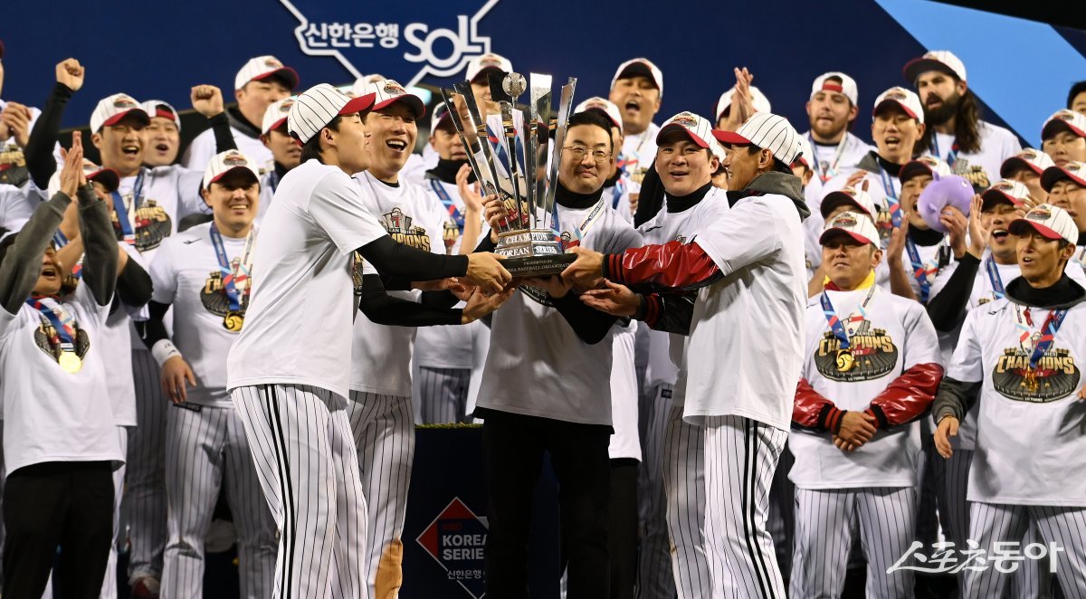 13일 서울 잠실야구장에서 ‘2023 신한은행 SOL KBO리그’ 포스트시즌 한국시리즈 5차전 KT 위즈와 LG 트윈스 경기가 열렸다. 6-2 승리를 거두며 한국시리즈 전적 4승 1패로 우승을 확정지은 LG 선수들이 구광모 회장과 우승트로피를 들고 환호하고 있다. 잠실 | 김종원 기자 won@donga.com