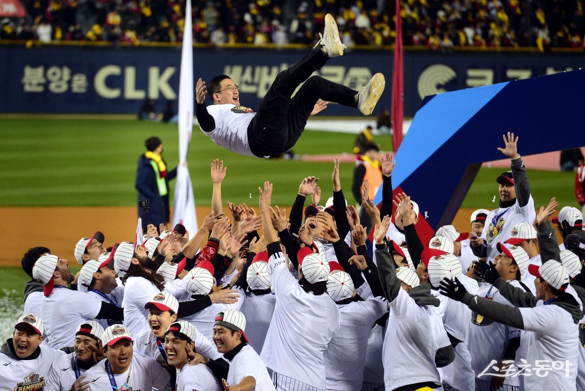 13일 서울 잠실야구장에서 ‘2023 신한은행 SOL KBO리그’ LG 트윈스와 kt 위즤의 한국시리즈 5차전 경기가 열렸다. LG가 kt를 꺾고 29년 만의 한국시리즈 우승을 차지한 후 LG 구광모 회장이 우승 헹가래를 받고 있다. 잠실 | 김민성 기자 marineboy@donga.com