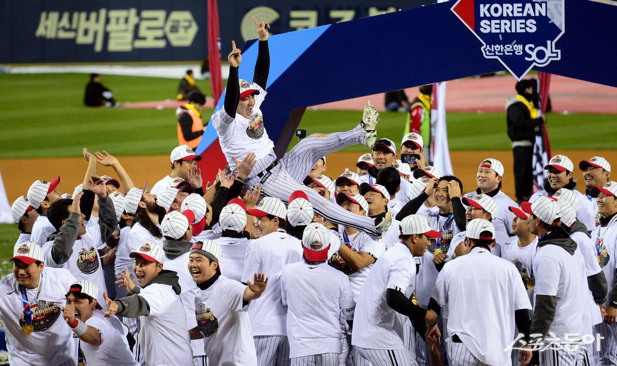 13일 서울 잠실야구장에서 ‘2023 신한은행 SOL KBO리그’ LG 트윈스와 kt 위즤의 한국시리즈 5차전 경기가 열렸다. LG가 kt를 꺾고 29년 만의 한국시리즈 우승을 차지한 후 주장 오지환이 우승 헹가래를 받고 있다. 잠실 | 김민성 기자 marineboy@donga.com